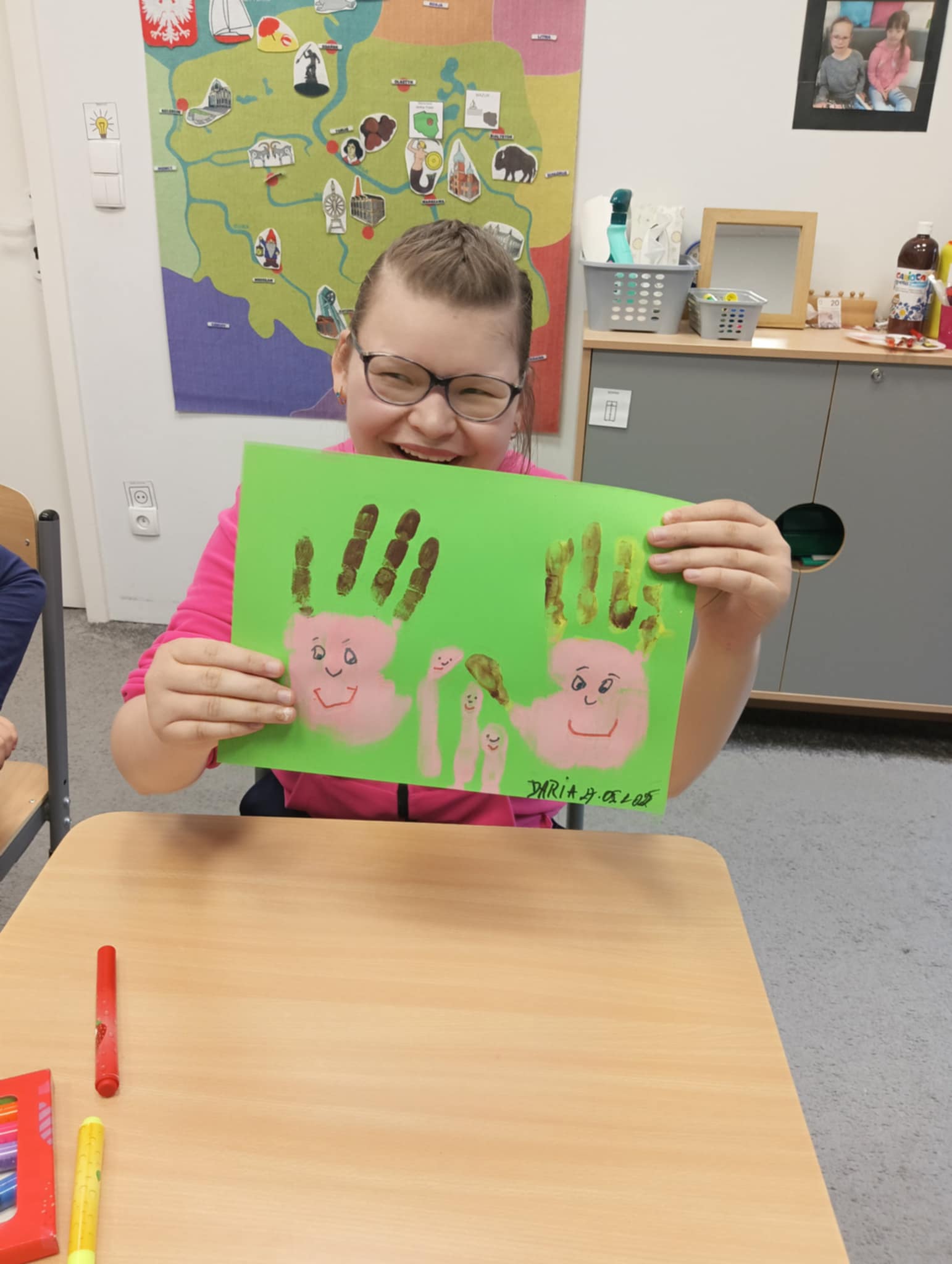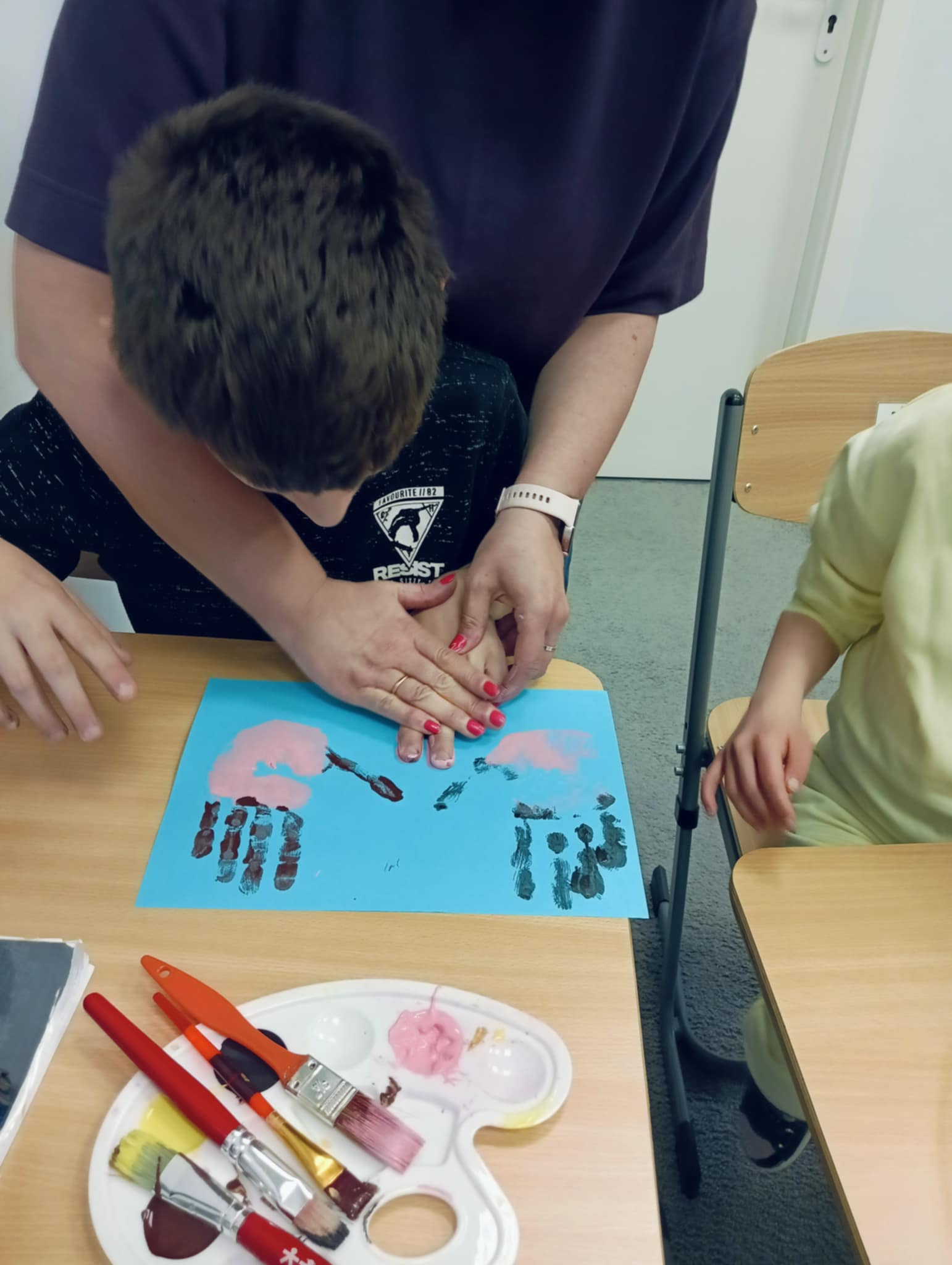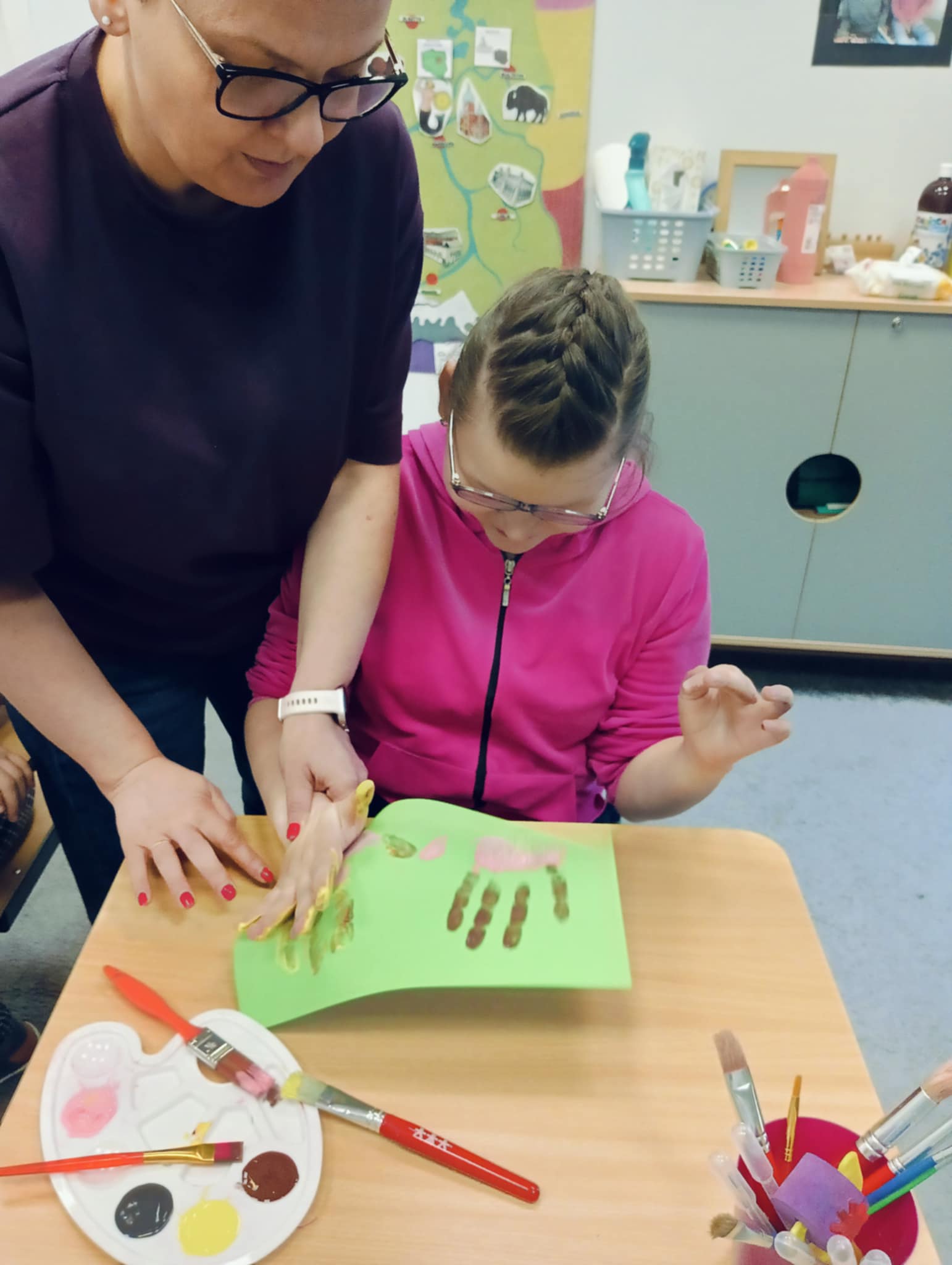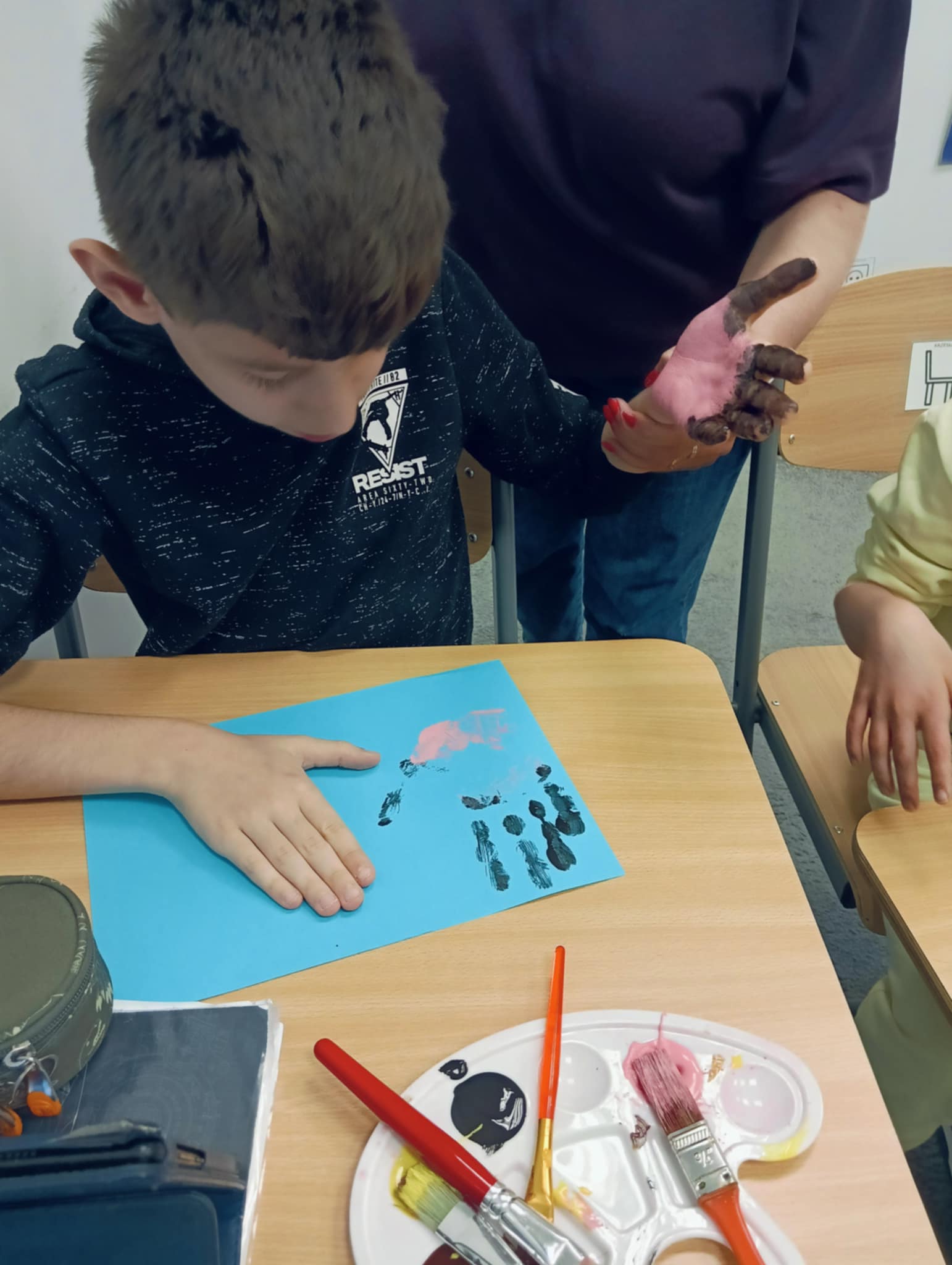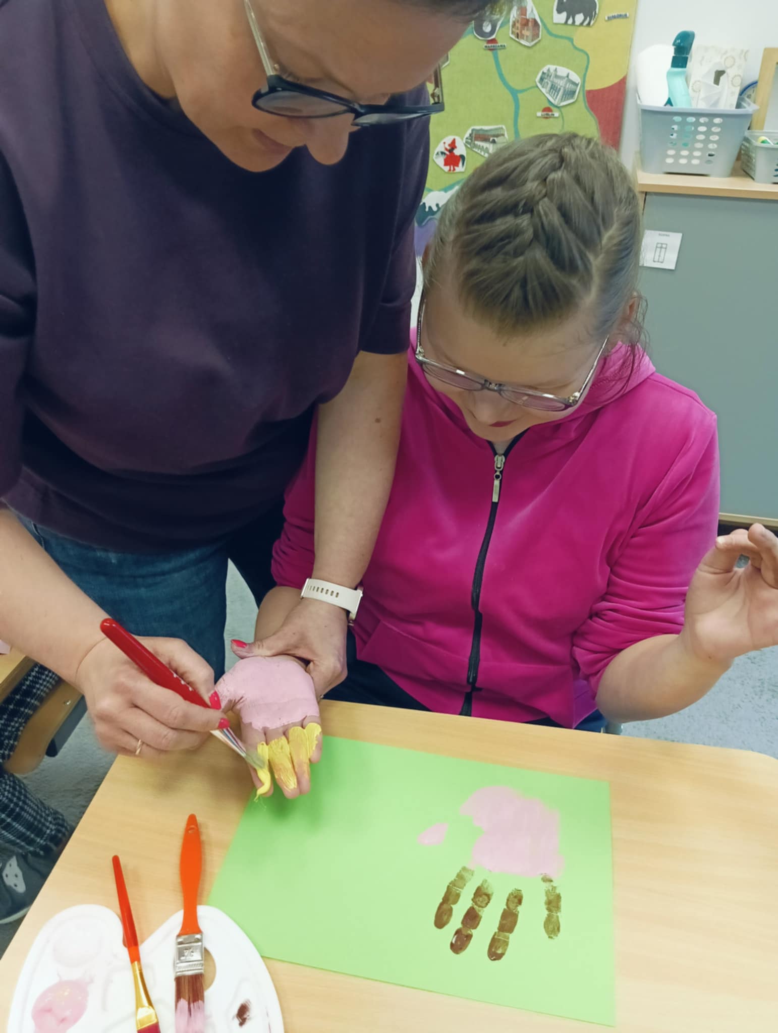 Każdy z nas ma rodzinę, która odgrywa bardzo ważną rolę w naszym życiu. W trakcie tygodnia poświęconego tematyce rodziny uczniowie mieli okazję podzielić się informacjami o swoich najbliższych. Wykorzystując oprogramowanie MÓW-ik, opowiedzieli o swoich rodzicach, rodzeństwie , opiekunach oraz dziadkach. Uczniowie z zaangażowaniem opisywali, z kim najczęściej spędzają wolny czas oraz jakie aktywności podejmują wspólnie z najbliższymi im osobami – były to m.in. spacery, zabawy, wspólne oglądanie filmów czy czytanie książek. Podsumowaniem tygodnia były zajęcia plastyczne, które pozwoliły uczniom wyrazić swoją wdzięczność i uczucia wobec bliskich. Uczniowie Oddziału „I” stworzyli barwne prace plastyczne, wykorzystując do tego farby oraz odbicia własnych dłoni – symbol bliskości i więzi rodzinnych. Natomiast uczniowie Oddziału „II” wykonali piękne kompozycje przy użyciu kolorowych kartek papieru i kredek, przedstawiające ich rodziny.