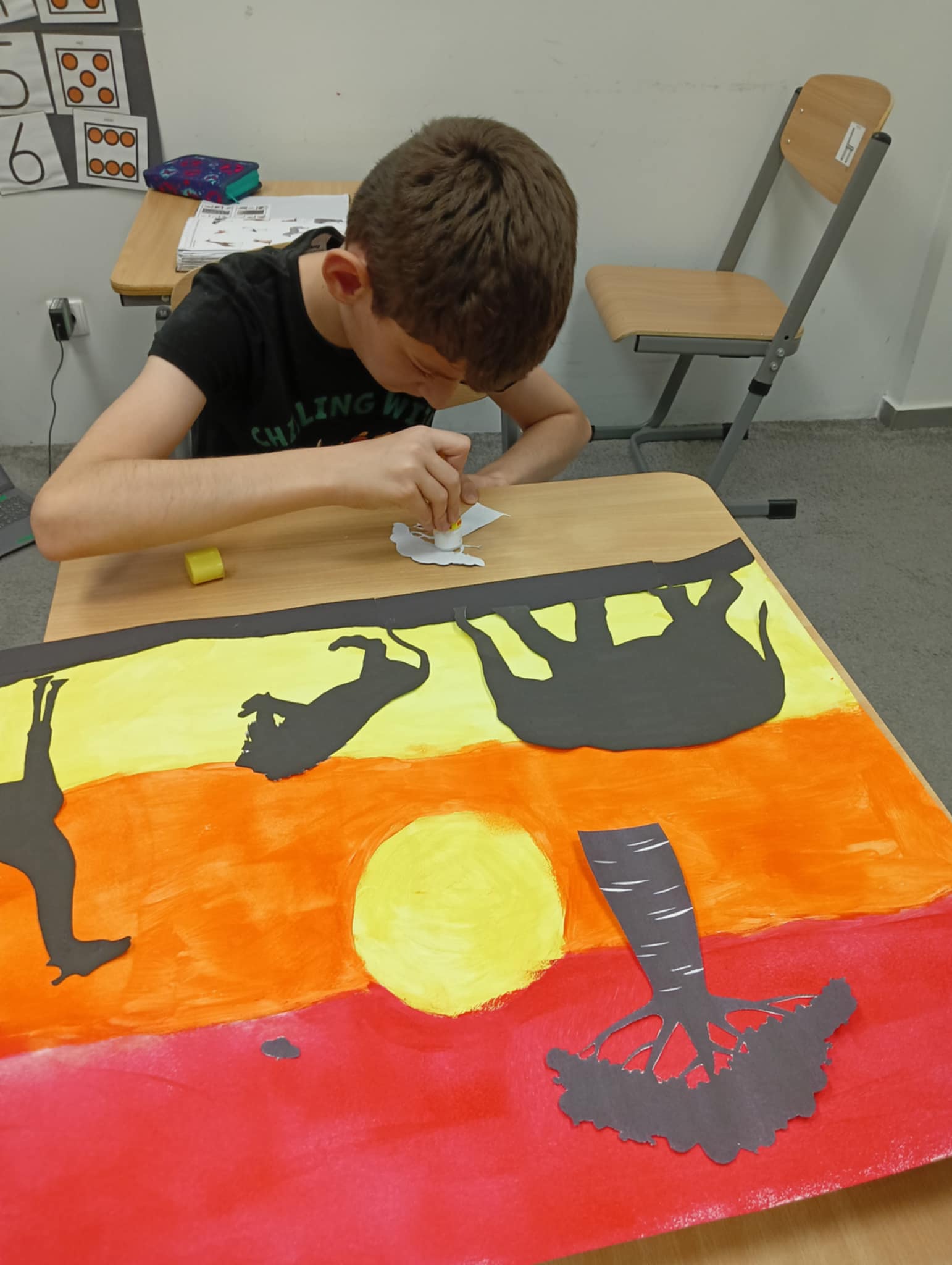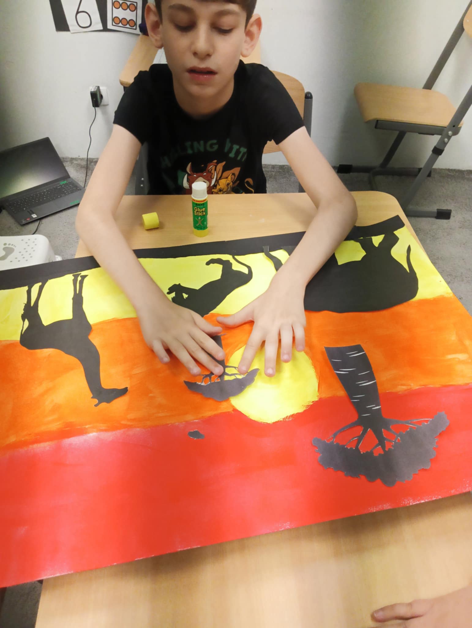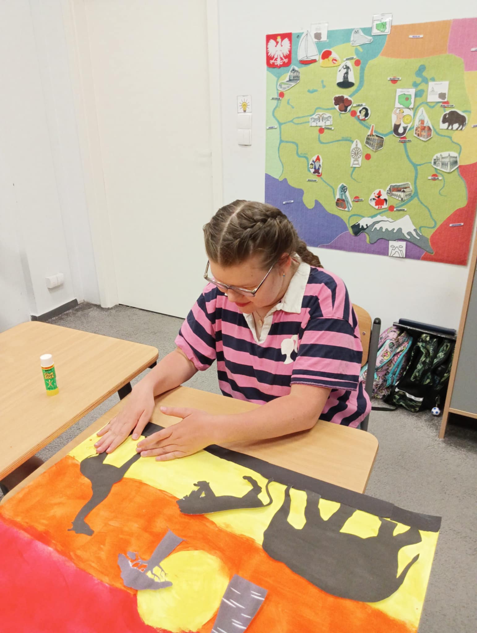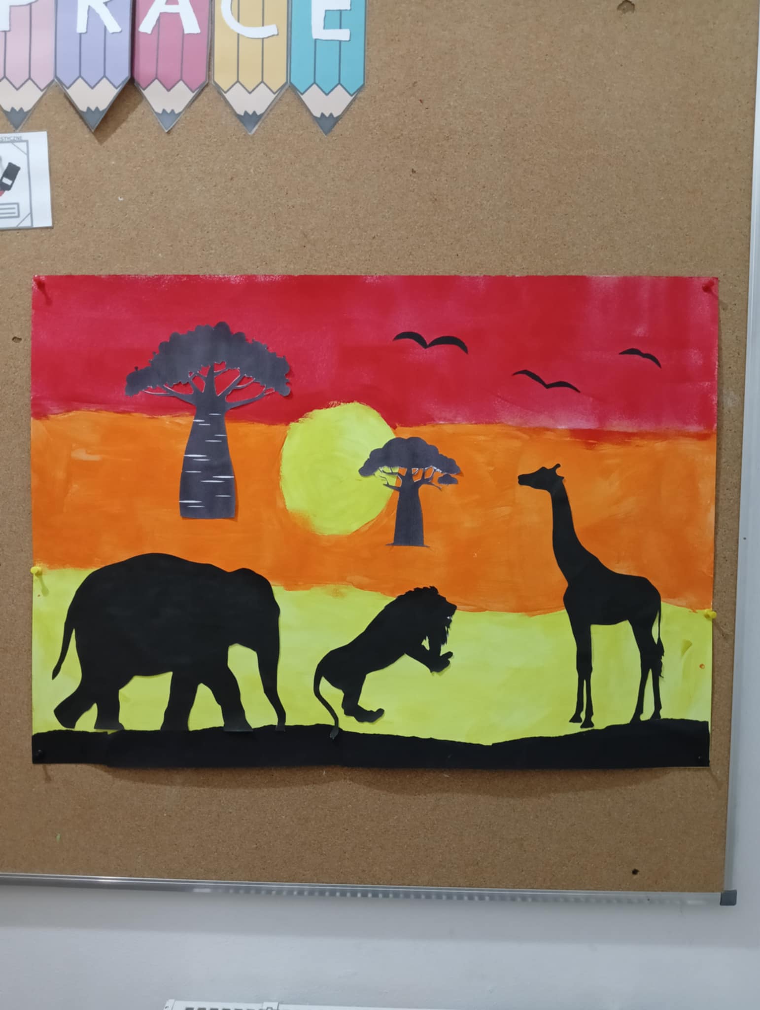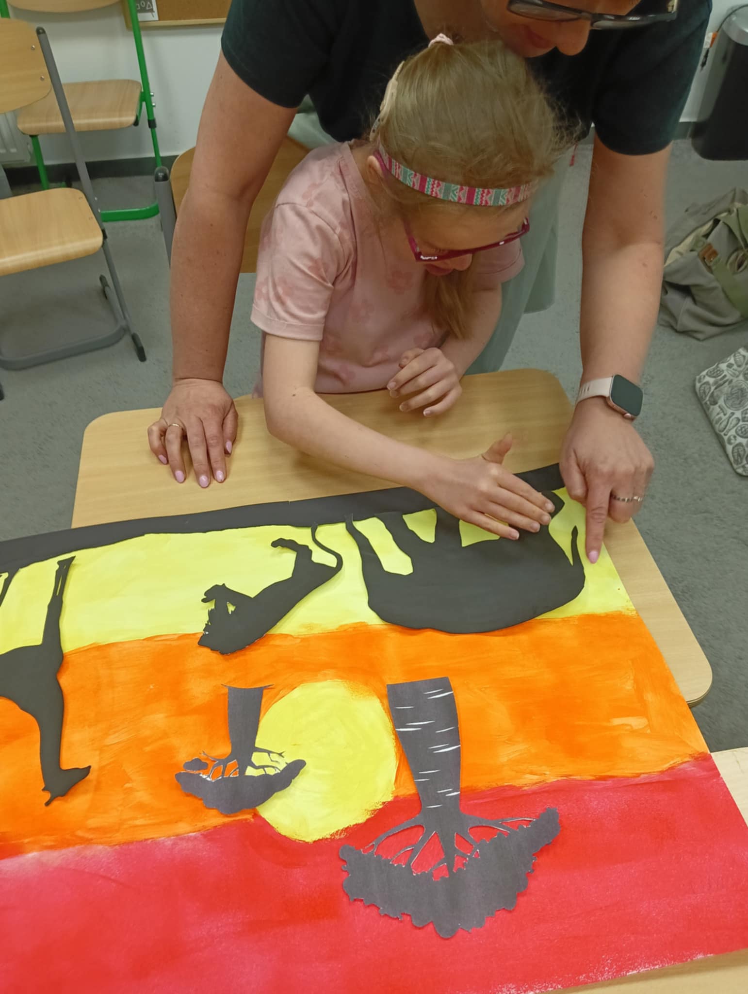 Uczniowie oddziału I podczas tygodniowego cyklu zajęć poświęconego tematowi „Dzikie zwierzęta” z zaangażowaniem zgłębiali wiedzę o mieszkańcach sawanny, dżungli, lasów i innych naturalnych środowisk. Poznawali nazwy dzikich zwierząt, ich charakterystyczne cechy, sposób poruszania się, zwyczaje oraz środowiska, w których żyją. Dowiadywali się również, jaką rolę pełnią te zwierzęta w przyrodzie i jak ważna jest ich ochrona. W trakcie zajęć dzieci uczyły się rozpoznawać odgłosy różnych dzikich zwierząt, co wzbudzało wiele emocji i radości. Omawiano również zagrożenia, jakie mogą nieść spotkania z dzikimi zwierzętami w naturalnym środowisku, oraz uczono zasad bezpiecznego zachowania w ich pobliżu. W ramach zajęć rozwijających kreatywność uczniowie wykonali wspólnie dużą pracę plastyczną zatytułowaną „Sawanna”. Tworząc kolorowy krajobraz z żyrafami, lwami i słoniami, dzieci rozwijały swoją wyobraźnię plastyczną, ćwiczyły sprawność manualną, a także uczyły się współpracy i dzielenia zadaniami. Praca była nie tylko okazją do twórczego działania, ale również do utrwalenia zdobytej wiedzy o dzikiej przyrodzie. Powstała praca została wyeksponowana w szkolnym korytarzu, budząc zachwyt zarówno uczniów, jak i odwiedzających ją dorosłych.
