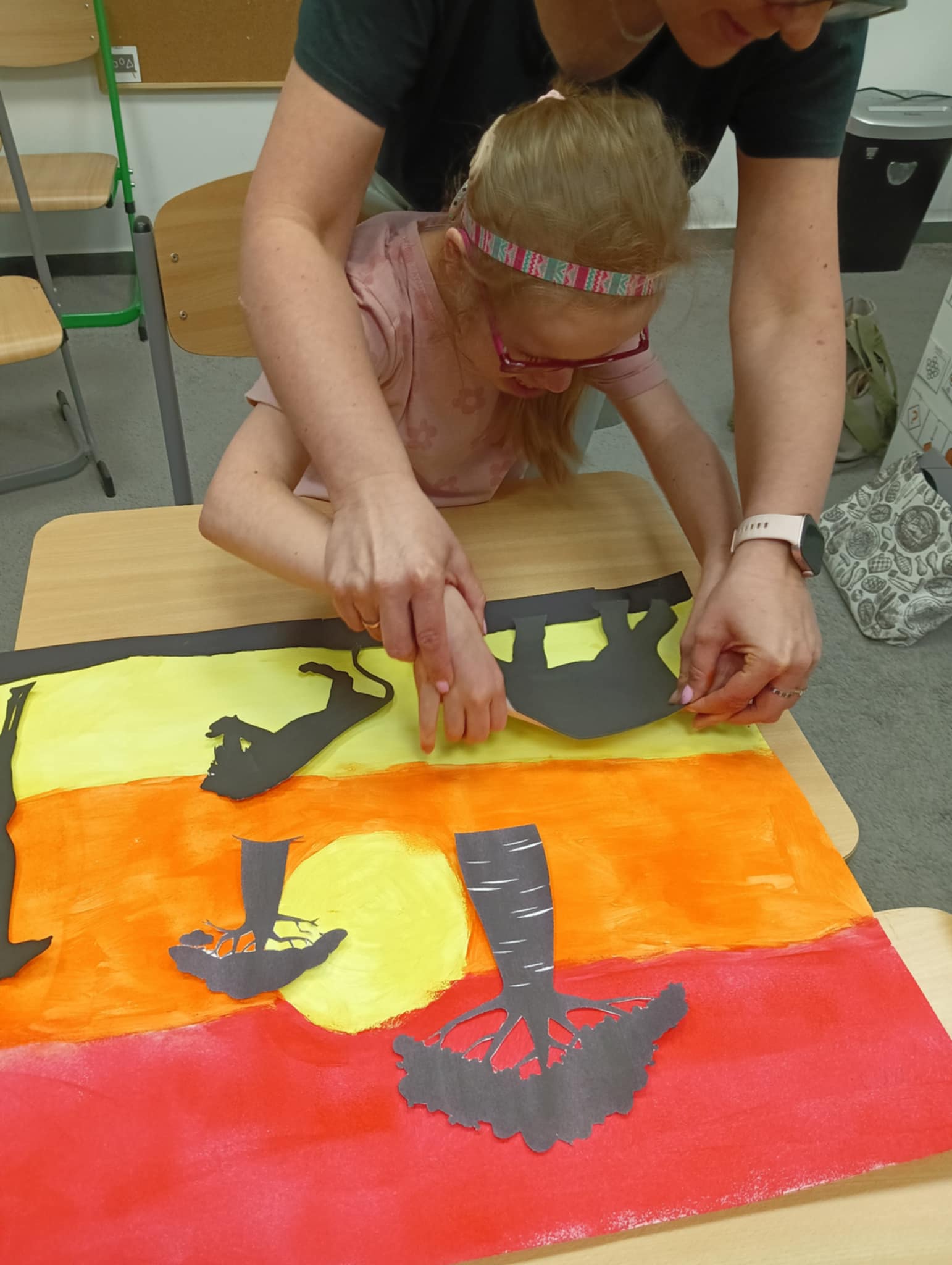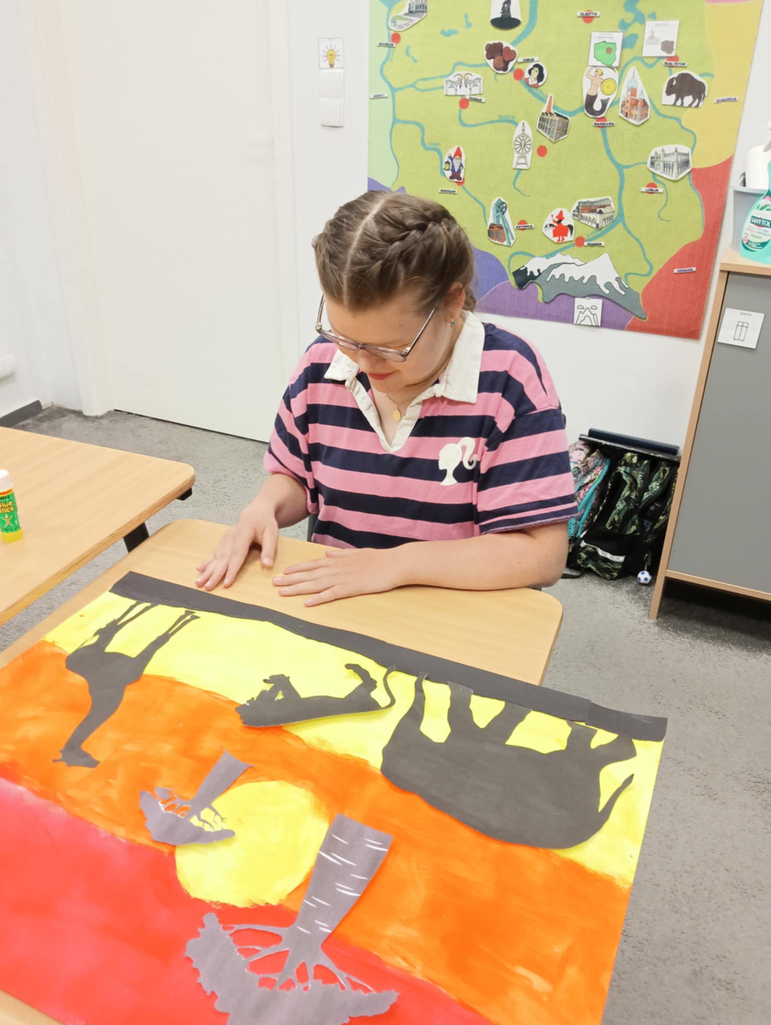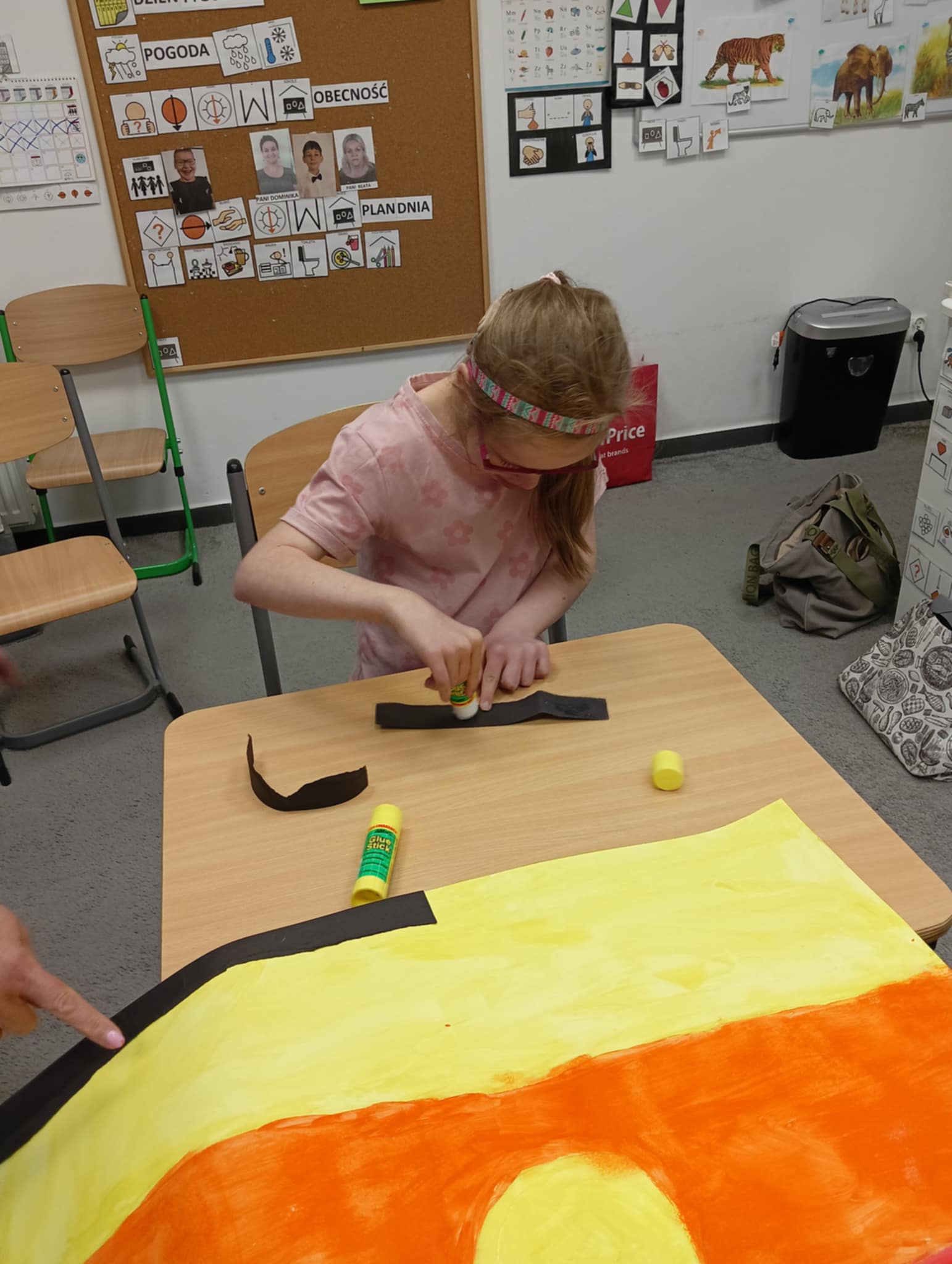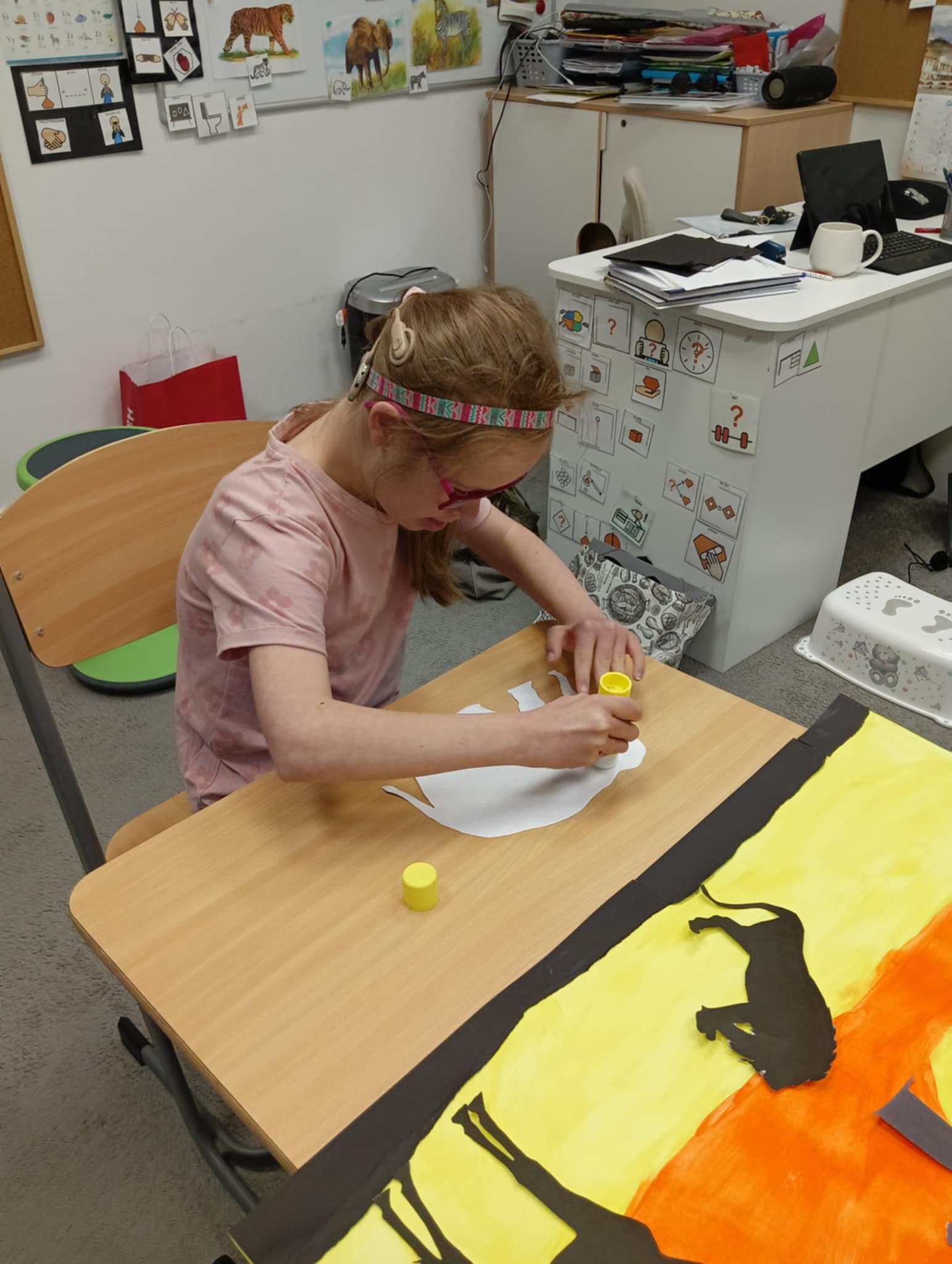 Uczniowie oddziału I podczas tygodniowego cyklu zajęć poświęconego tematowi „Dzikie zwierzęta” z zaangażowaniem zgłębiali wiedzę o mieszkańcach sawanny, dżungli, lasów i innych naturalnych środowisk. Poznawali nazwy dzikich zwierząt, ich charakterystyczne cechy, sposób poruszania się, zwyczaje oraz środowiska, w których żyją. Dowiadywali się również, jaką rolę pełnią te zwierzęta w przyrodzie i jak ważna jest ich ochrona. W trakcie zajęć dzieci uczyły się rozpoznawać odgłosy różnych dzikich zwierząt, co wzbudzało wiele emocji i radości. Omawiano również zagrożenia, jakie mogą nieść spotkania z dzikimi zwierzętami w naturalnym środowisku, oraz uczono zasad bezpiecznego zachowania w ich pobliżu. W ramach zajęć rozwijających kreatywność uczniowie wykonali wspólnie dużą pracę plastyczną zatytułowaną „Sawanna”. Tworząc kolorowy krajobraz z żyrafami, lwami i słoniami, dzieci rozwijały swoją wyobraźnię plastyczną, ćwiczyły sprawność manualną, a także uczyły się współpracy i dzielenia zadaniami. Praca była nie tylko okazją do twórczego działania, ale również do utrwalenia zdobytej wiedzy o dzikiej przyrodzie. Powstała praca została wyeksponowana w szkolnym korytarzu, budząc zachwyt zarówno uczniów, jak i odwiedzających ją dorosłych.