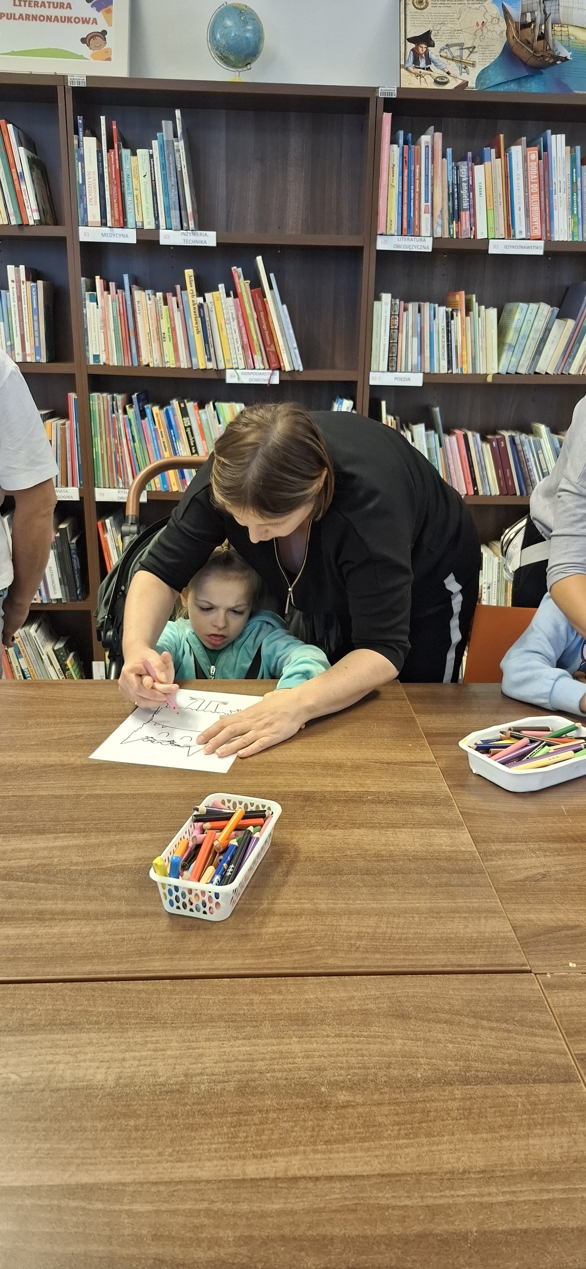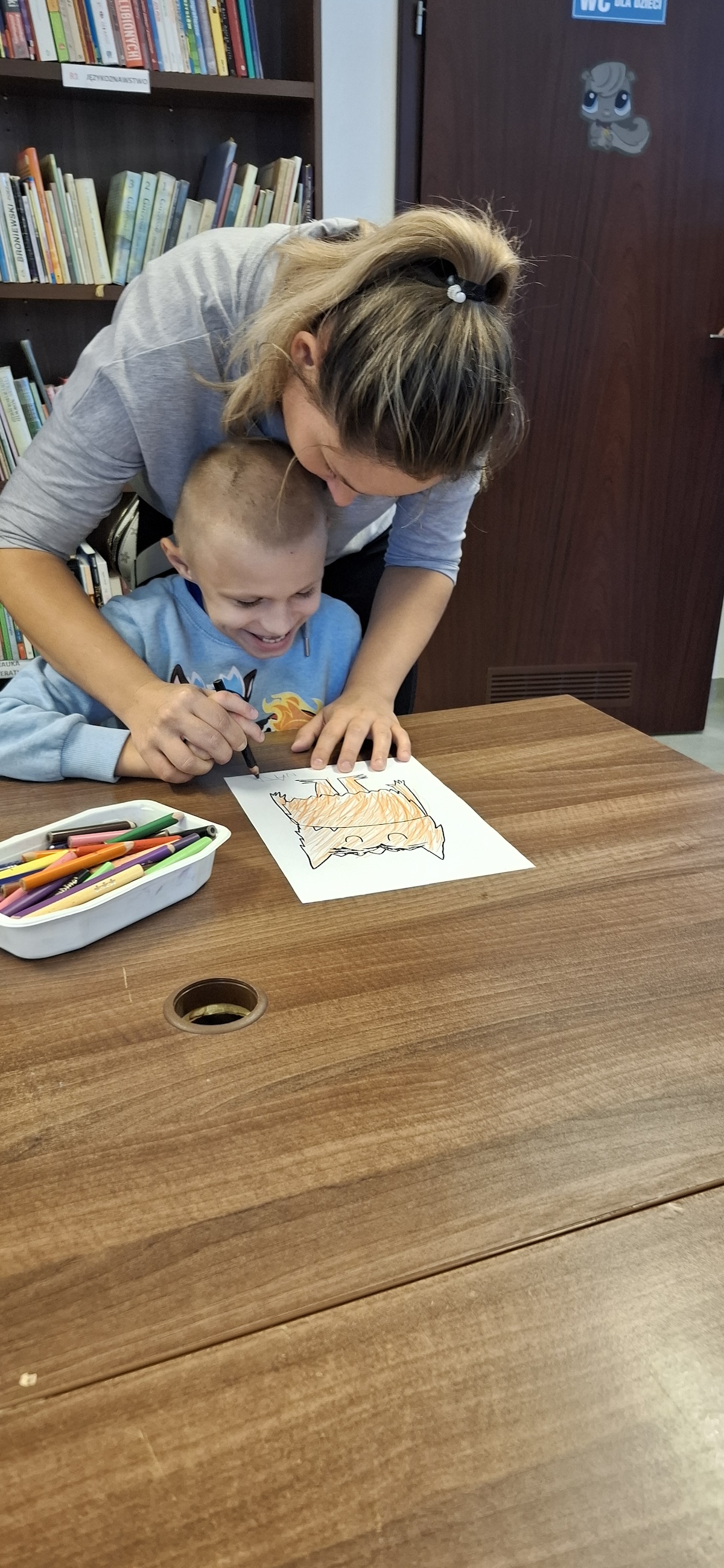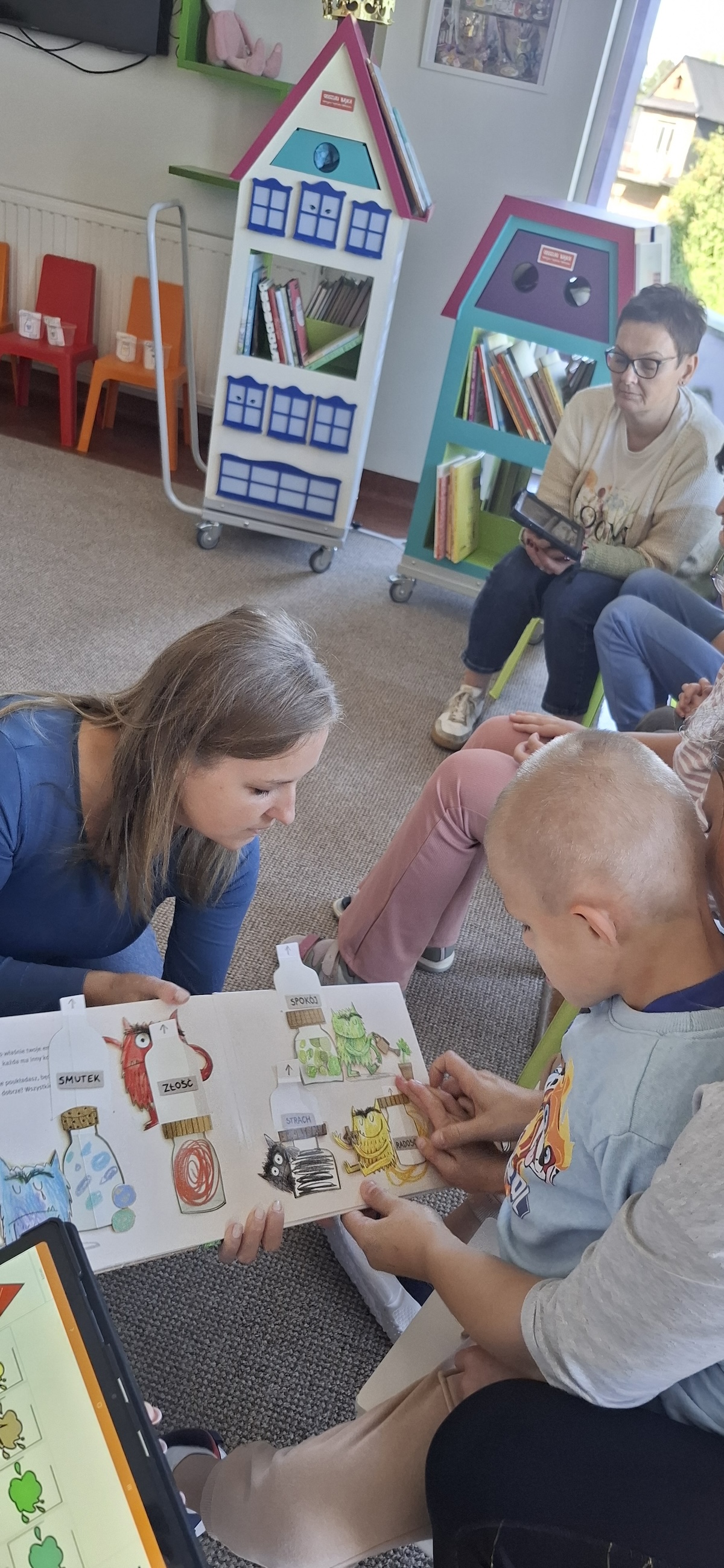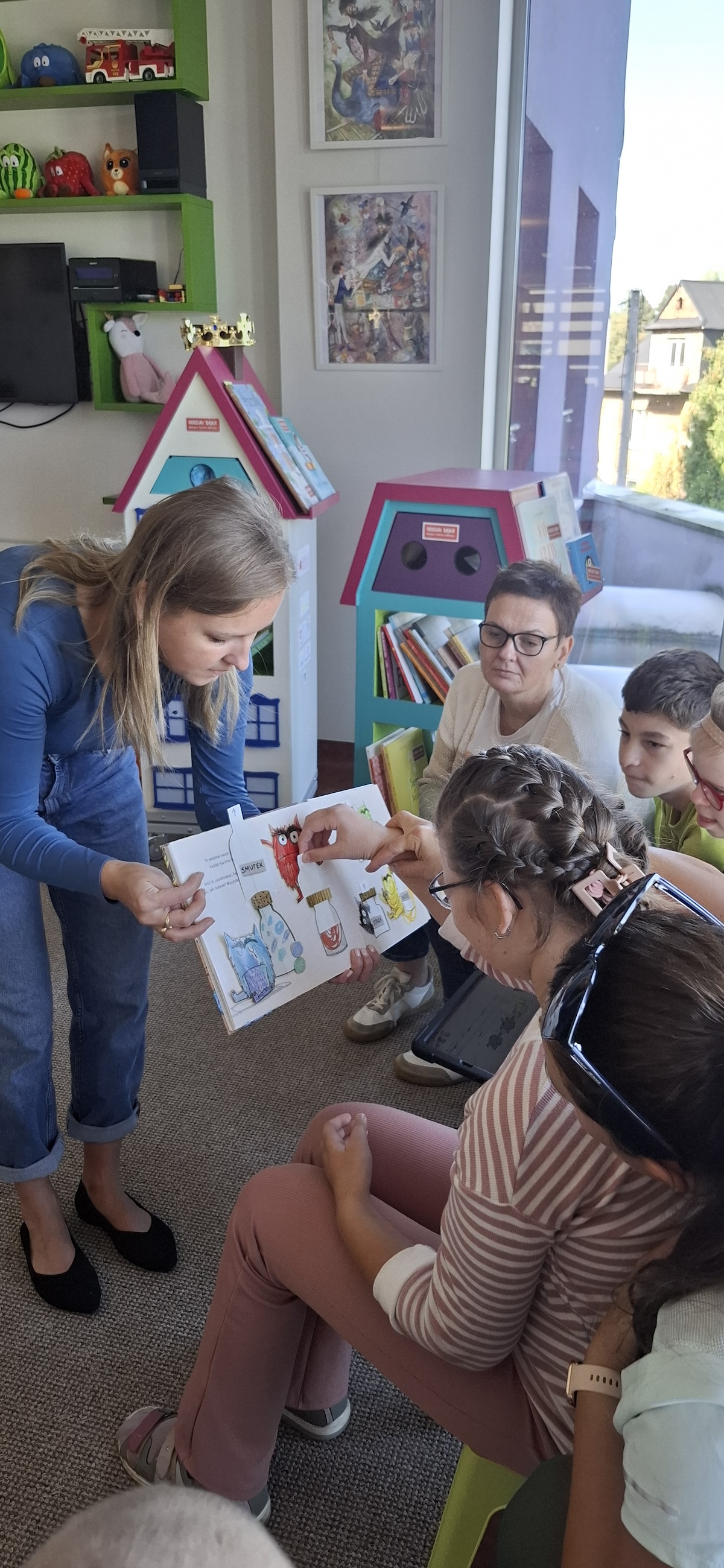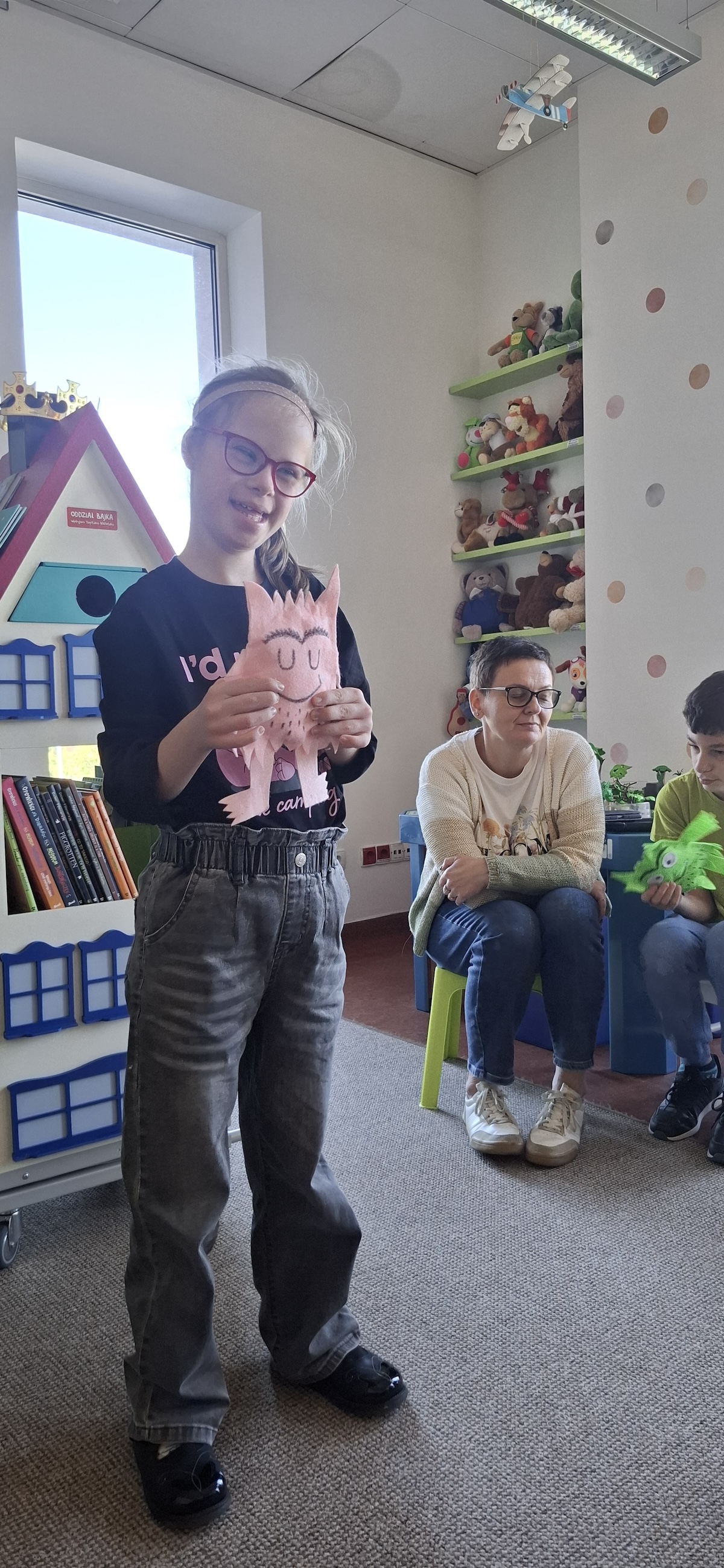 Dnia 18 września nasza szkoła wybrała się na pierwszą w tym roku szkolnym wizytę do Centrum Kulturalno-Bibliotecznego w Brzesku, do zaprzyjaźnionego oddziału dziecięcego. Podczas zajęć Pani przygotowała dla nas czytankę o emocjach. Następnie dzieci szukały ukrytych w „Bajkowozie” maskotek przedstawiających różne emocje i nazywały je. Kolejnym zadaniem było łowienie „rybek” – w każdej z nich, ukrytej w plastikowym jajku, znajdował się kolor emocji, który należało dopasować do odpowiedniej maskotki. Najwięcej radości sprawiła dzieciom zabawa w odkrywanie kolorów poprzez wstrząsanie słoiczkiem – woda w nim zmieniała barwę na kolor danej emocji. Na zakończenie wykonaliśmy pracę plastyczną „Moja własna emocja” – każdy uczeń mógł ozdobić ją według własnego pomysłu. Czas upłynął tak szybko, że nawet nie zauważyliśmy, kiedy zajęcia dobiegły końca.