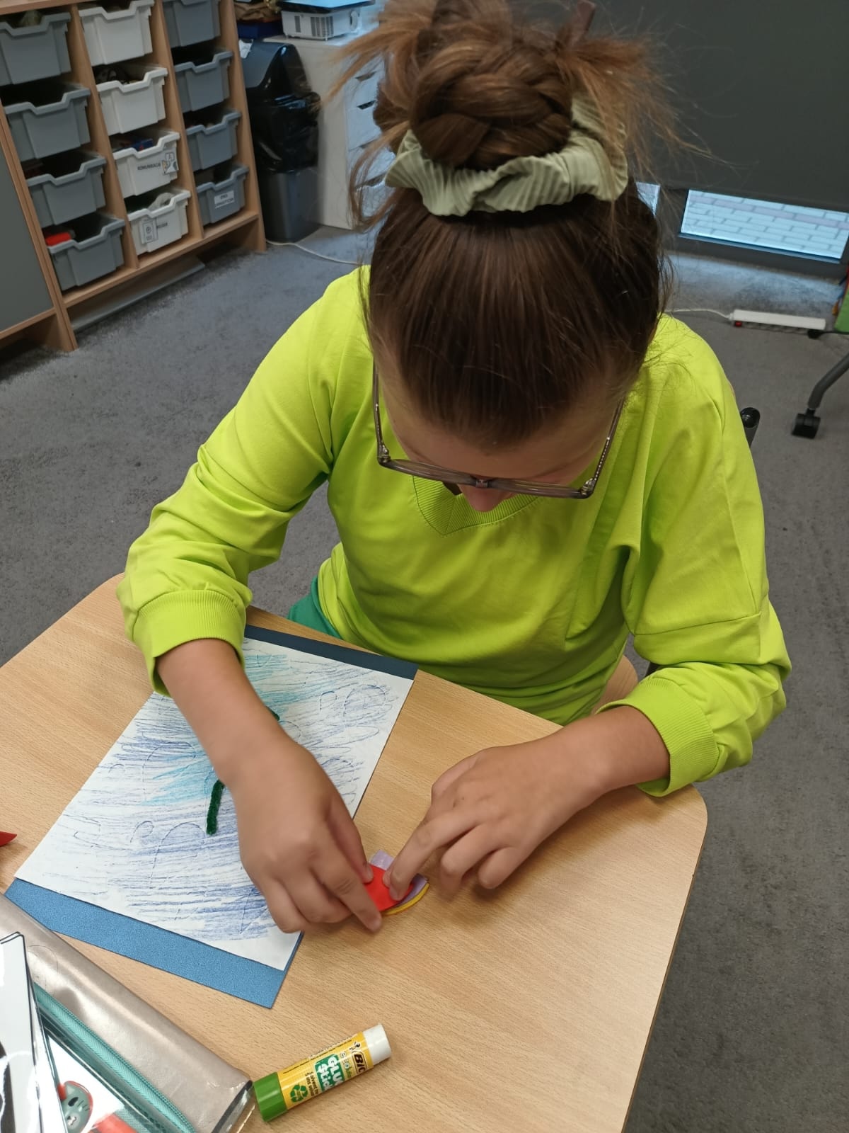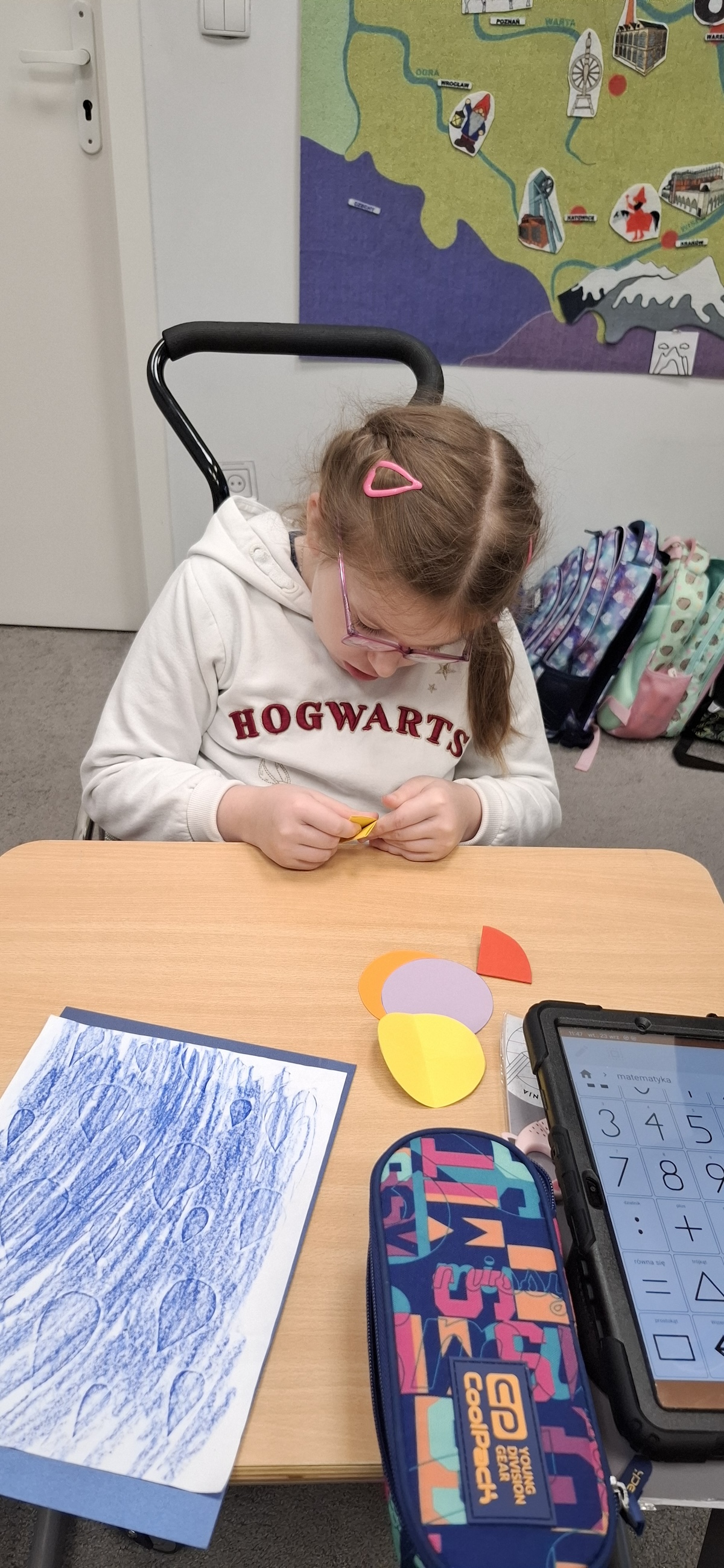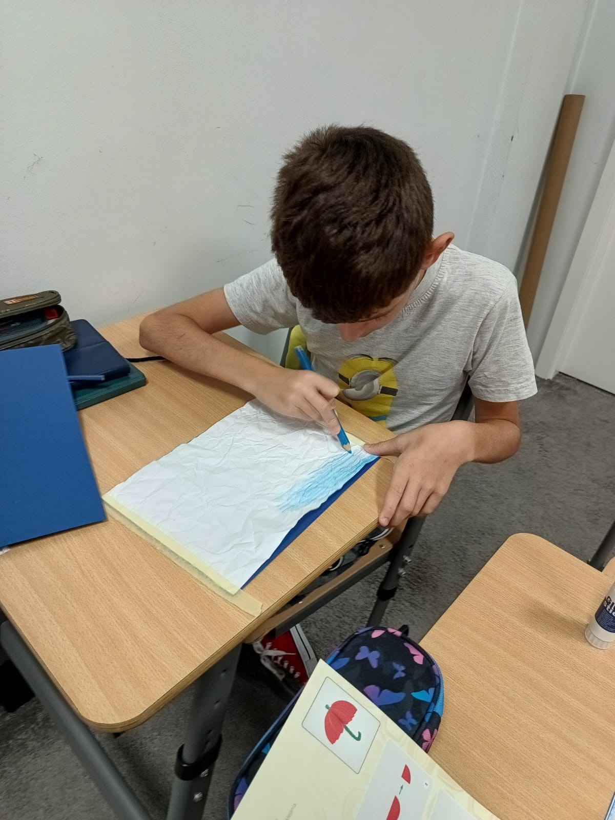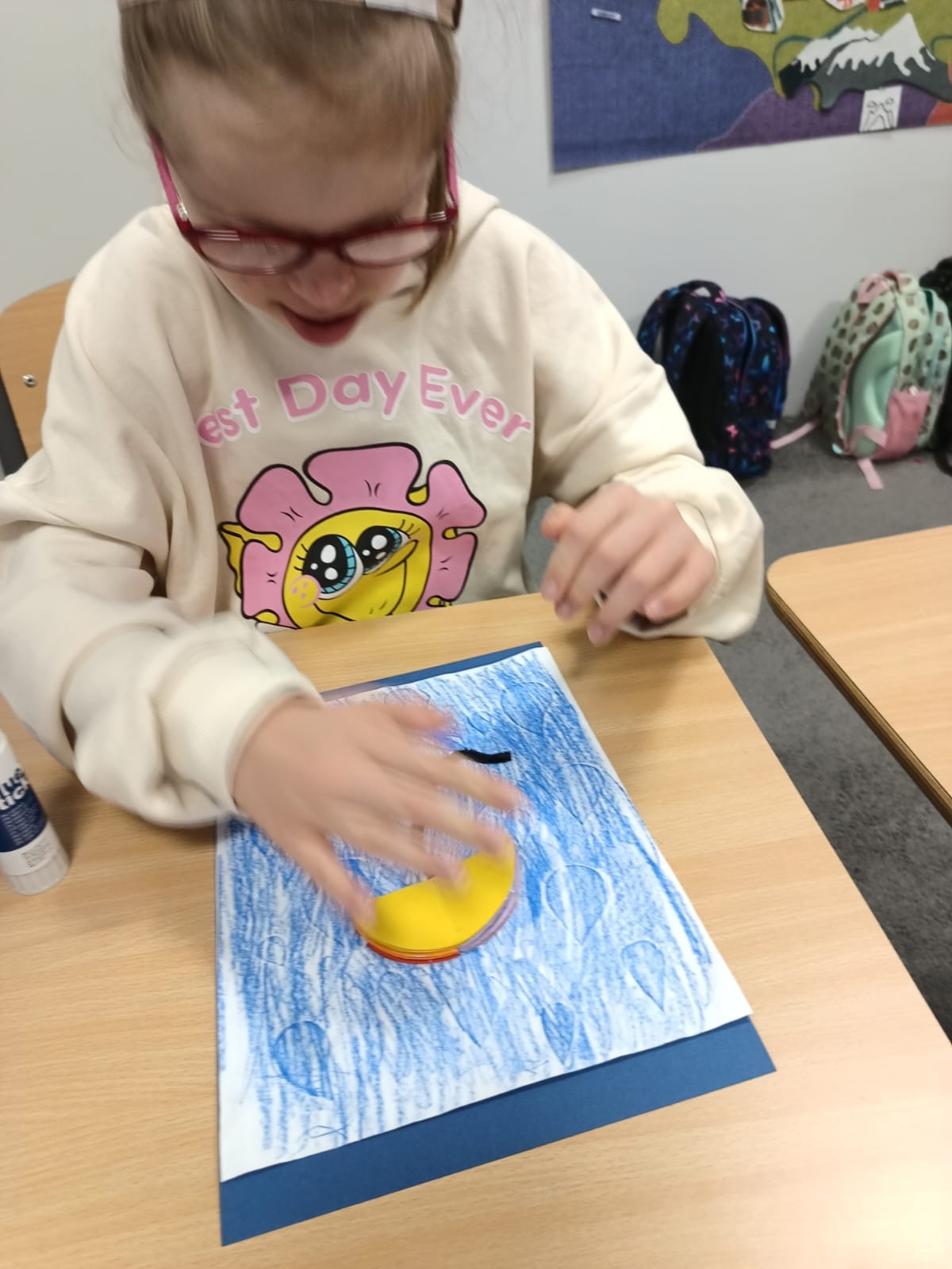 W tygodniu o tematyce Jesieni, uczniowie oddziału „I” w ramach zajęć rozwijających kreatywność wykonali pracę plastyczną „ Jesienna pogoda” wykonując ciekawą techniką „deszcz”, a na nim kolorowe parasolki z kółek. Podczas zajęć uczniowie utrwalali wiadomości dotyczące jesiennej pogody, kształt koła, pojęcie połowy, ćwiartki oraz kolory.