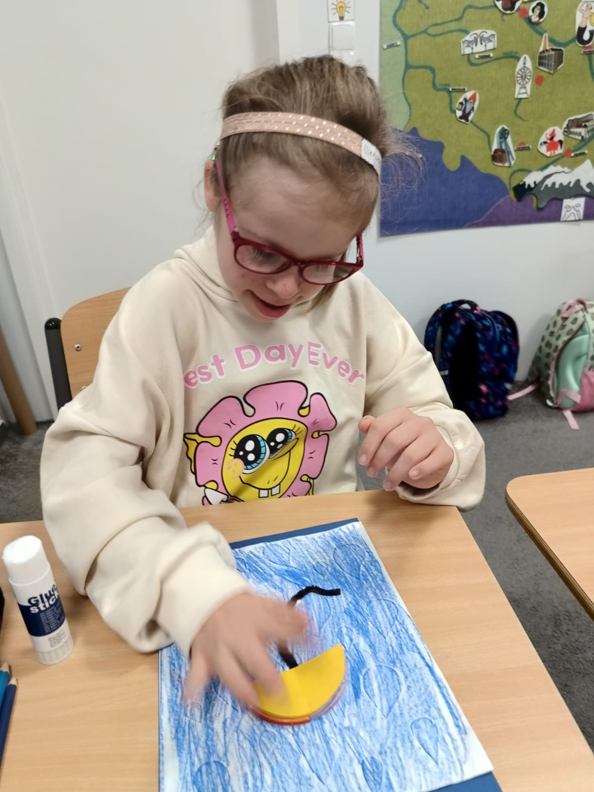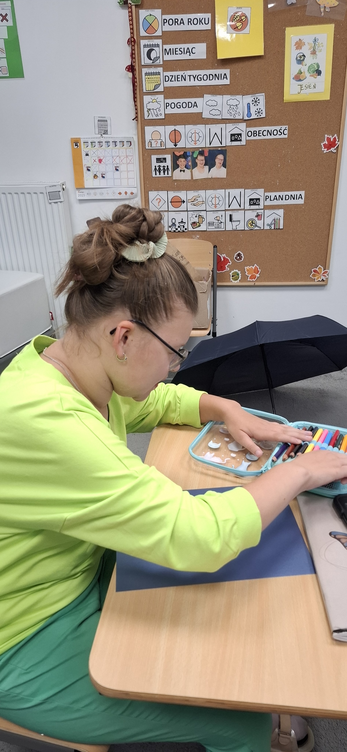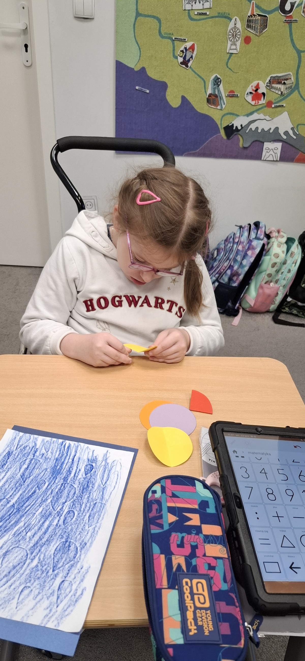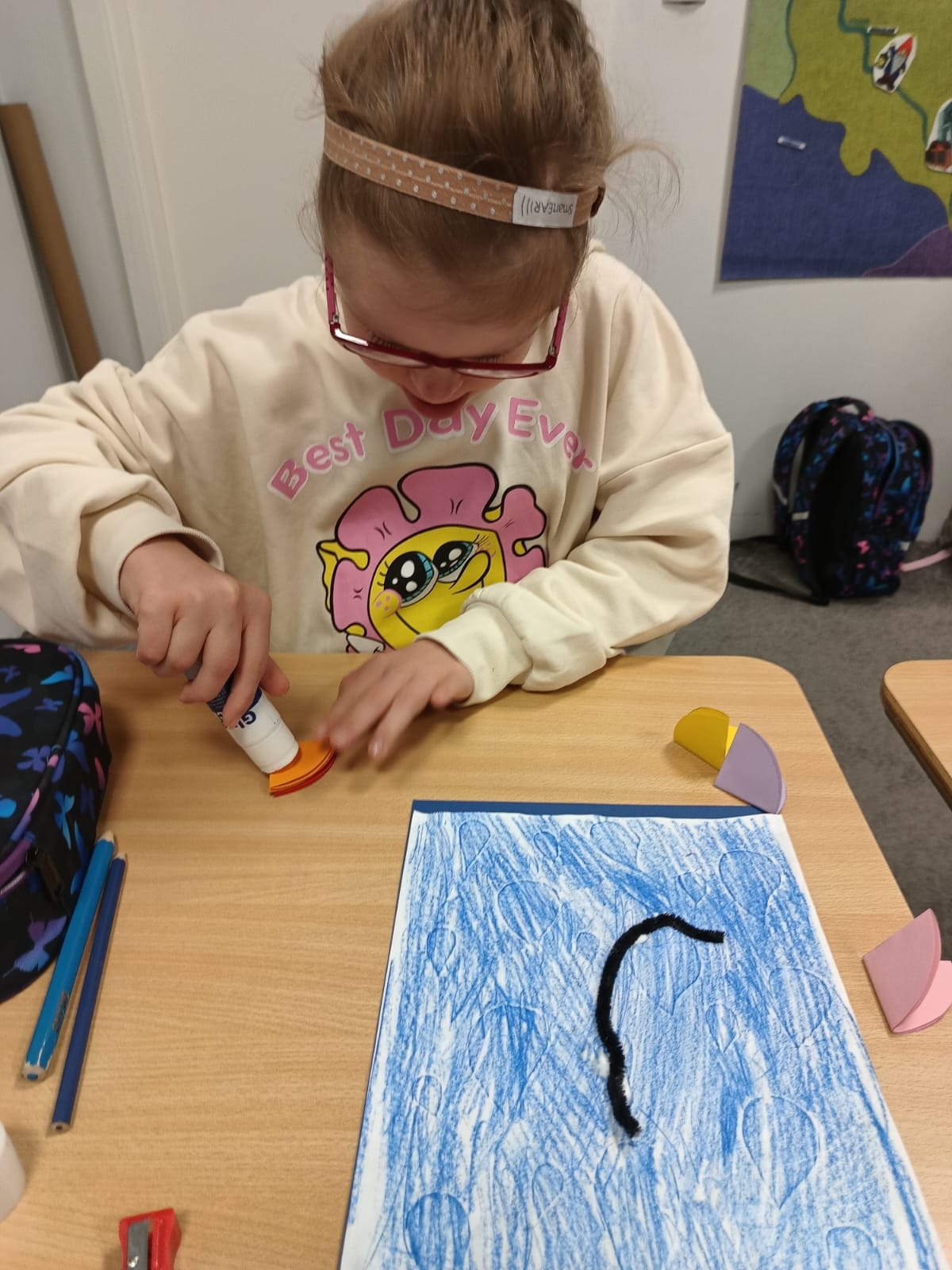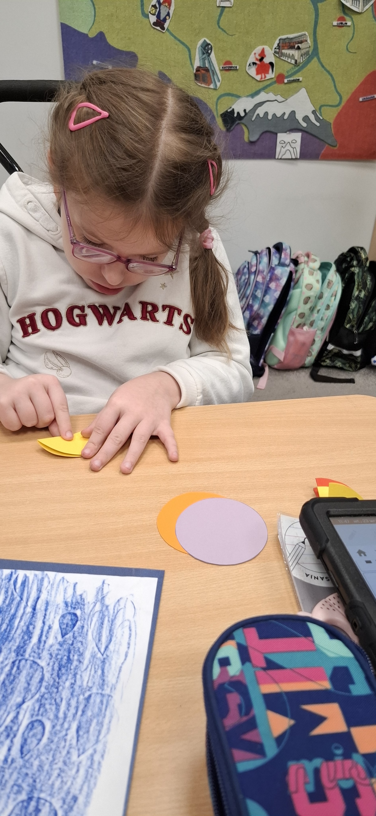 W tygodniu o tematyce Jesieni, uczniowie oddziału „I” w ramach zajęć rozwijających kreatywność wykonali pracę plastyczną „ Jesienna pogoda” wykonując ciekawą techniką „deszcz”, a na nim kolorowe parasolki z kółek. Podczas zajęć uczniowie utrwalali wiadomości dotyczące jesiennej pogody, kształt koła, pojęcie połowy, ćwiartki oraz kolory.