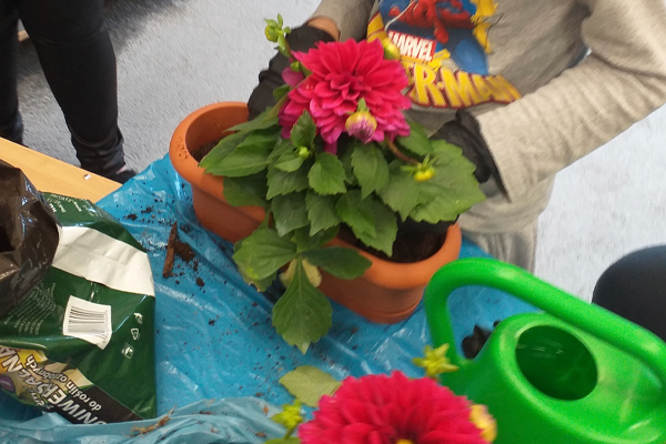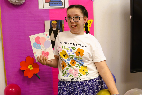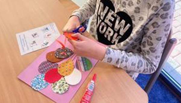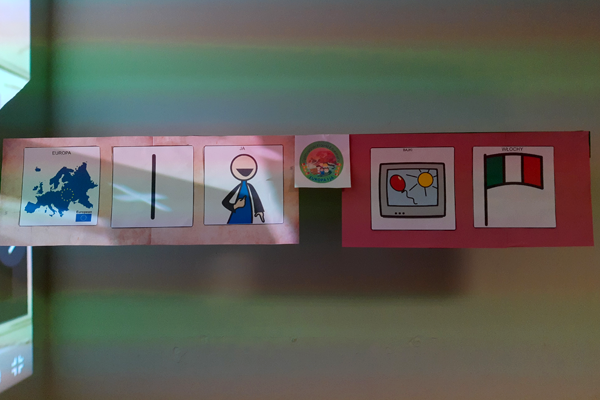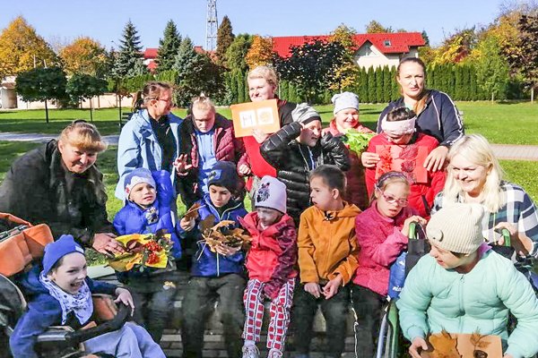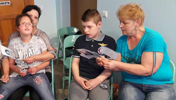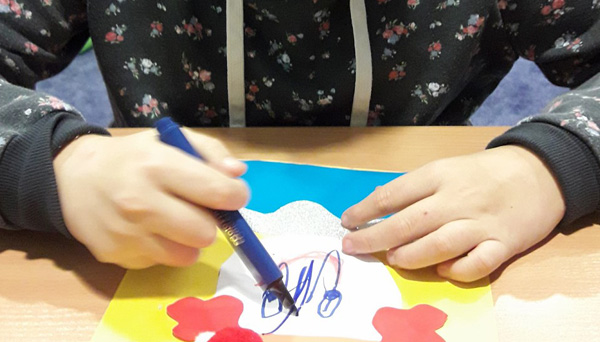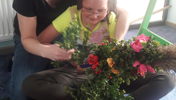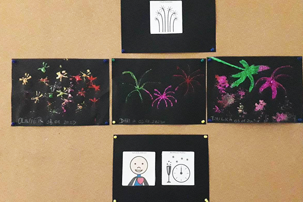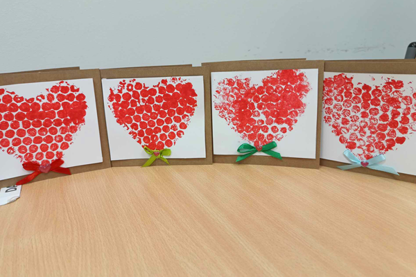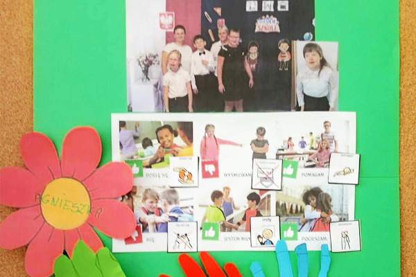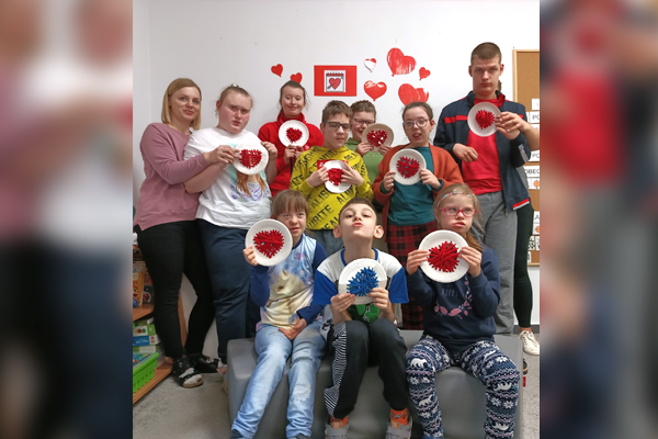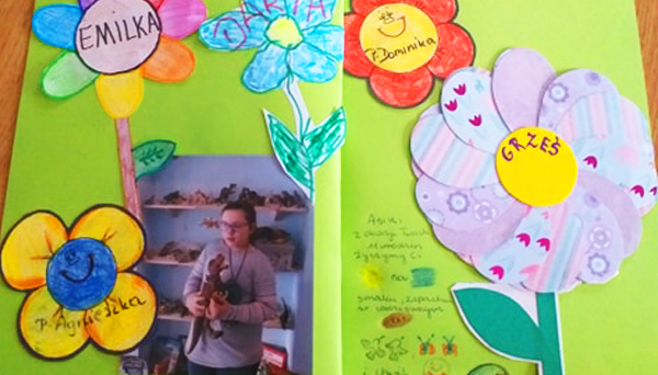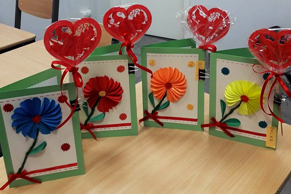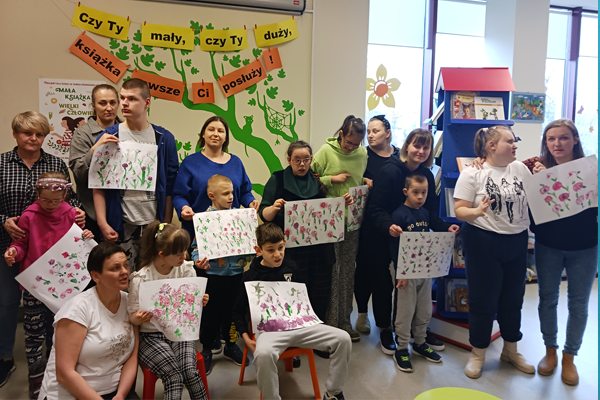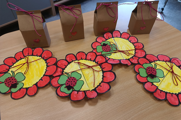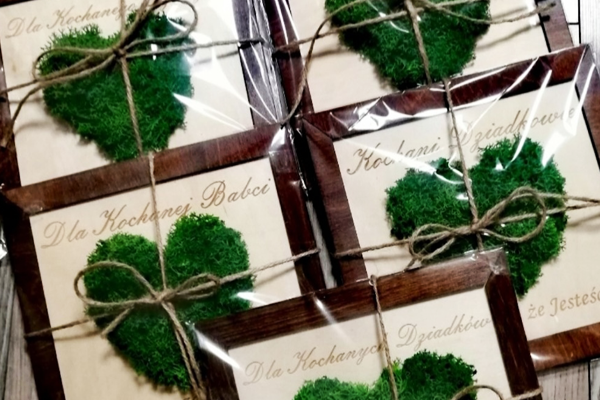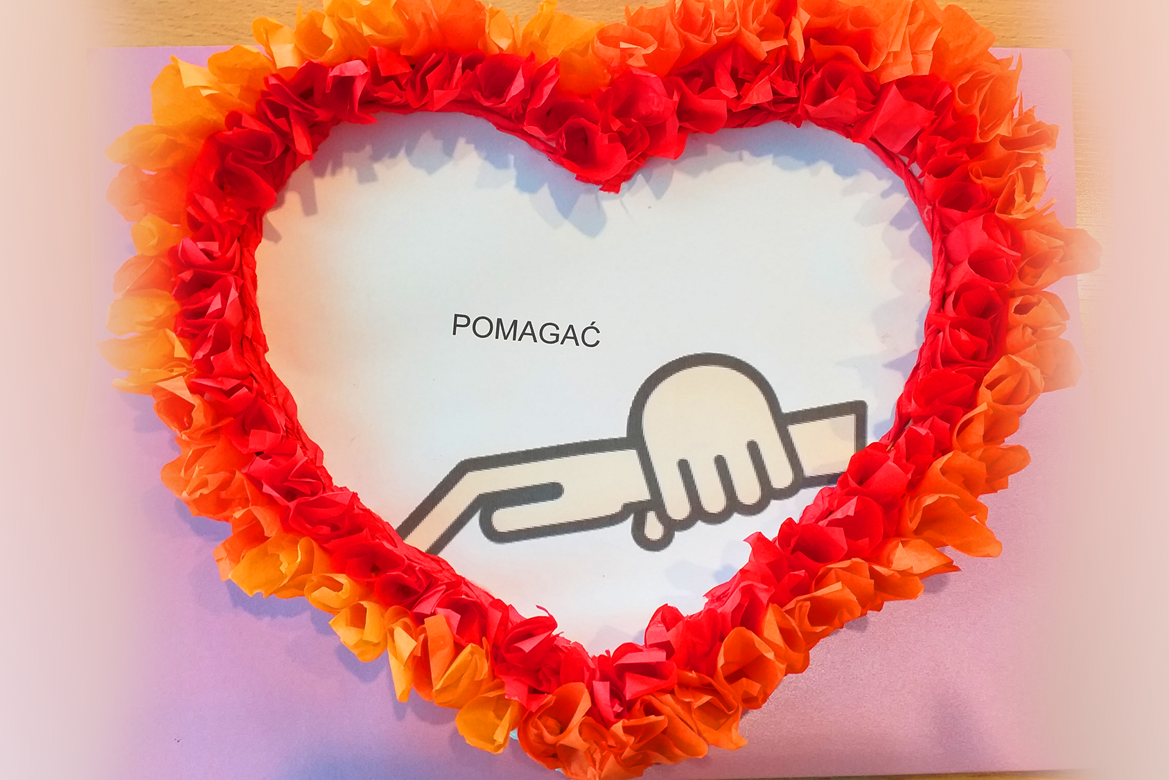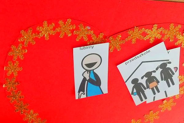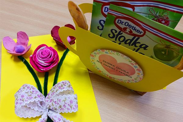 Uczniowie oddziału „II” również wykonali piękne prace. Na ozdobnych kartkach rysowali serce, które następnie wyklejali sztucznym mchem. W centralnym miejscu każdej laurki znalazł się symbol MÓWikowy „KOCHAM CIĘ”, wyrażający uczucia w zrozumiały sposób. Wykonane z ogromnym zaangażowaniem i radością kartki zostały wręczone babciom i dziadkom podczas wspólnych warsztatów florystycznych zorganizowanych z okazji ich święta. Był to piękny czas spotkań, bliskości i wzruszeń.