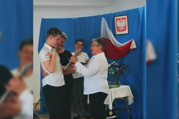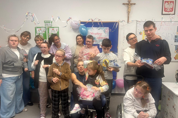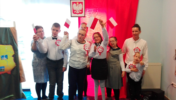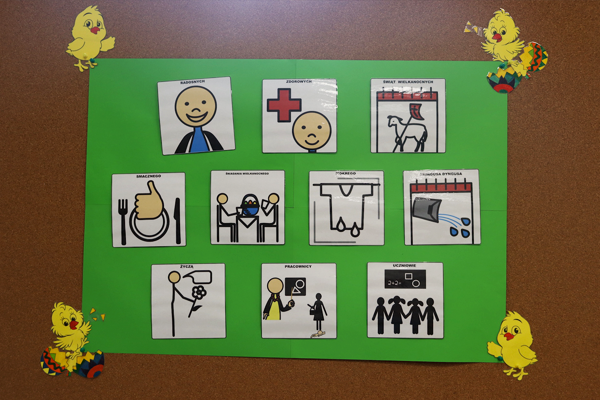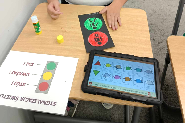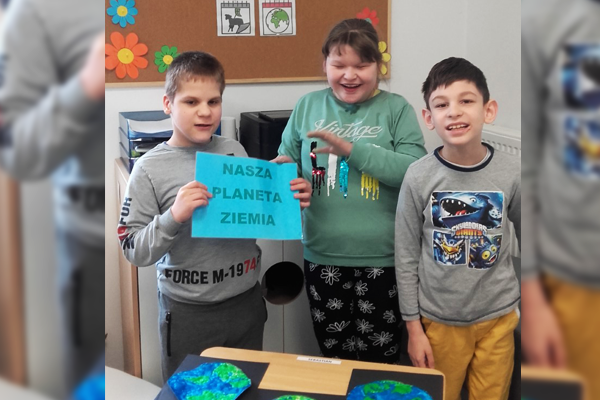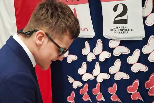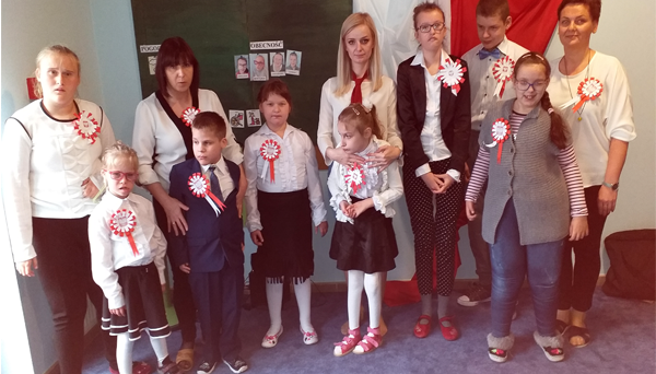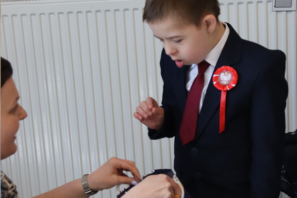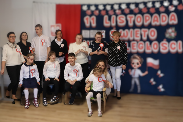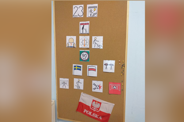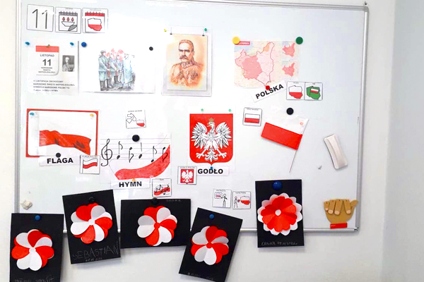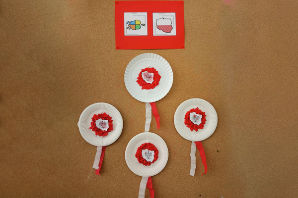 Podczas zajęć plastycznych dzieci wykonywały prace na temat „Polska”. Zajęcia miały charakter sensoryczny i patriotyczny – łączyły elementy plastyki, dotyku oraz rozwijania sprawności manualnej. Dzieci utrwalały barwy narodowe i poznawały symbole naszego kraju w sposób dostosowany do ich możliwości. W pierwszej części zajęć uczniowie tworzyli zasypywanki sensoryczne w barwach narodowych. Wykorzystywali do tego różne materiały o ciekawych fakturach, m.in. ryż barwiony na czerwono i biało. Dzięki temu mogli doświadczać różnorodnych wrażeń dotykowych oraz ćwiczyć precyzję ruchów podczas wsypywania i rozprowadzania ryżu. Tematem zasypywanek były symbole Polski – flaga i mapa Polski. W drugiej części dzieci wykonały kotyliony w barwach biało-czerwonych, poznając przy tym znaczenie barw narodowych. Uczniowie wycinali, składali i przyklejali elementy, tworząc piękne kotyliony, które z dumą przypięli do swoich ubrań.