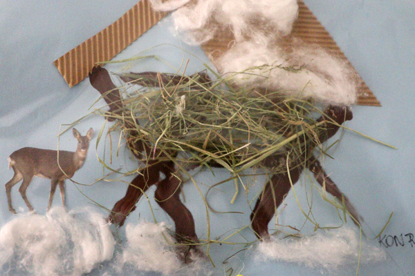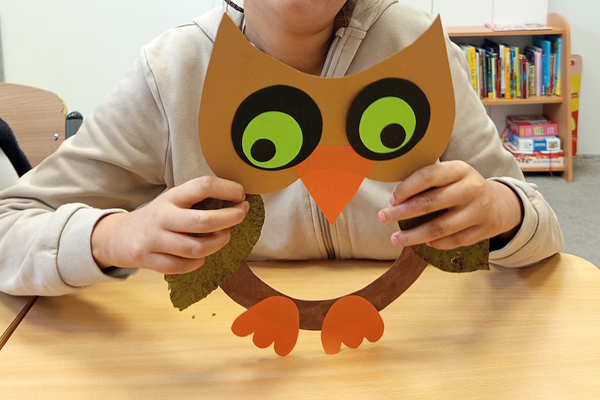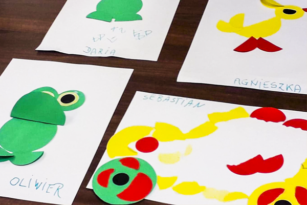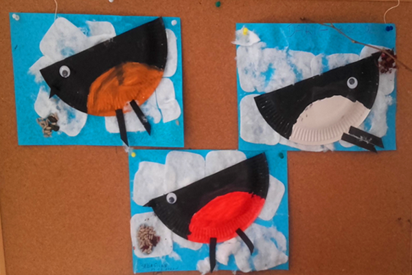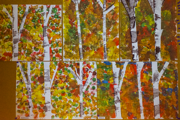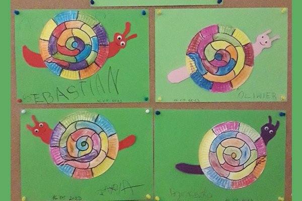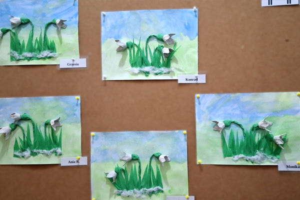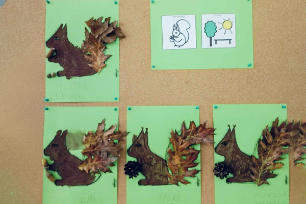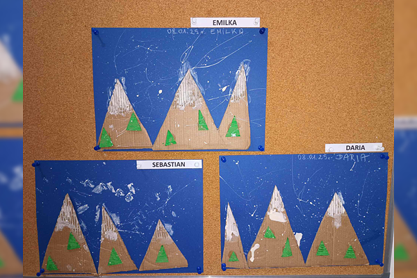 Podczas zajęć plastycznych uczniowie stworzyli wyjątkowe prace przedstawiające zwierzęta zimową porą. Wykorzystując różnorodne materiały, takie jak kolorowy papier w kształcie kół oraz nasiona, dzieci rozwijały swoją kreatywność, wyobraźnię oraz zdolności manualne. Zajęcia miały również walor edukacyjny – uczniowie utrwalali znajomość kształtów (szczególnie koła), ćwiczyli rozpoznawanie i nazywanie kolorów, a także doskonalili umiejętność liczenia poprzez przeliczanie elementów na swoich pracach, takich jak ptaki. Powstałe kompozycje przedstawiają ptaki poszukujące pożywienia w zimowym krajobrazie. Prace nie tylko zachwycają pomysłowością i starannością wykonania, ale także uwrażliwiają dzieci na potrzeby zwierząt w trudnym okresie zimy, przypominając, jak ważna jest pomoc i troska o przyrodę.