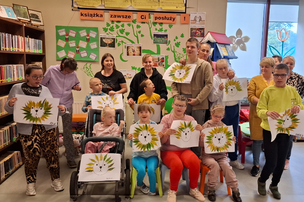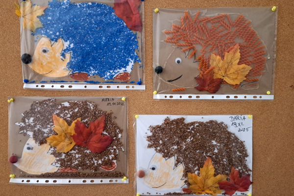 Tematem naszego tygodnia były zwierzęta przygotowujące się do zimy. Dzieci z oddziału III wykonały pracę plastyczną przedstawiającą jeża, wykorzystując brązową włóczkę, z której powstał mięciutki pompon. Każde dziecko, z pomocą nauczyciela, przyklejało pompon do konturu jeża, tworząc miękką i puszystą sylwetkę zwierzęcia. Uczniowie oddziału I malowali kontur, pyszczek oraz łapki farbami, natomiast tułów wyklejali plasteliną. W plastelinę dzieci z dużym zaangażowaniem wbijały pestki słonecznika, ćwicząc sprawność manualną oraz koordynację wzrokowo-ruchową. Uczniowie oddziału II wykonali jeżyki z wykorzystaniem barwionego ryżu, makaronu oraz kaszy gryczanej. Podczas pracy uczniowie korzystali z obrazków w programie AAC Mówik, dzięki którym wskazywali, jaki kolor jeża wykonują, jednocześnie ćwicząc rozpoznawanie barw. Praca pozwoliła dzieciom rozwijać sprawność manualną, cierpliwość oraz kreatywność. Była także okazją do wyrażania radości i dumy z własnych dokonań. Każdy jeż stał się małą historią – opowieścią o tym, jak wspólne działanie pozwala tworzyć coś pięknego i wyjątkowego, a jednocześnie poznawać zwyczaje zwierząt przygotowujących się do zimy.