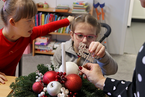 Podczas zajęć uczniowie wykonywali stroiki świąteczne z gałązek jodłowych oraz różnorodnych ozdób dekoracyjnych. W pracy wykorzystywali bombki, jabłuszka, światełka i inne elementy świąteczne. Zajęcia sprzyjały: rozwijaniu sprawności manualnej, ćwiczeniu koordynacji wzrokowo-ruchowej, rozpoznawaniu i nazywaniu kolorów oraz kształtów, rozwijaniu kreatywności i wyobraźni, doskonaleniu koncentracji uwagi. Wspólna praca wprowadziła uczniów w świąteczny nastrój i dała dużo radości z samodzielnie wykonanych dekoracji.