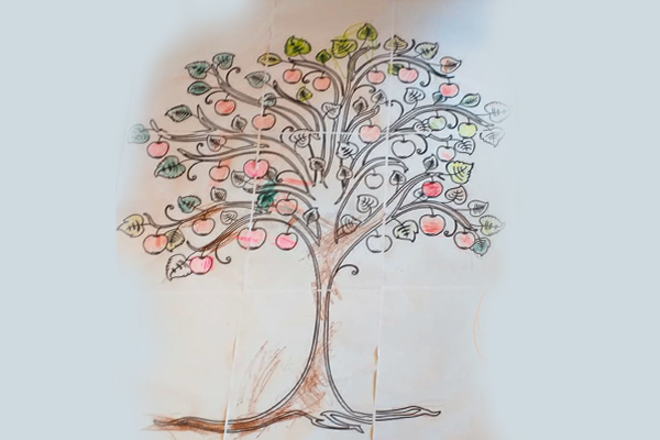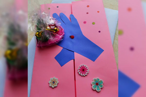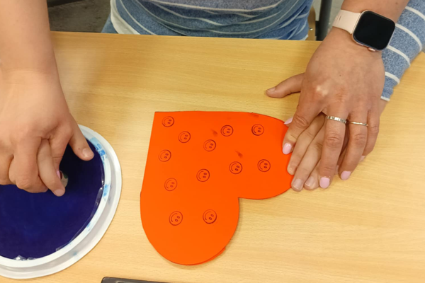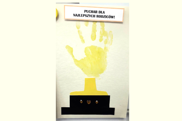 Uczniowie, przy wsparciu nauczycielek, odrysowali jego kształt, a następnie posmarowali powierzchnię klejem i wyklejali ją drobnymi, kolorowymi kółeczkami z papieru (konfetti). Z dużą cierpliwością i starannością przyklejali kolejne elementy, tworząc efekt przestrzennej, puszystej dekoracji. Na dole kartek umieścili wcześniej przygotowane napisy: „Dla Babci i Dziadka”, „Kochanej Babci” lub „Kochani Dziadkowie”, naklejone na ozdobnych paskach papieru.