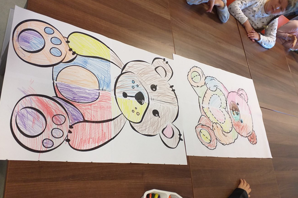 Następnie dzieci z oddziału III przystąpiły do zajęć plastycznych. Na przygotowanym wcześniej szablonie misia, przy wsparciu nauczyciela, nakładały klej i posypywały sylwetkę misia brązową posypką, tworząc fakturę przypominającą futerko. Na zakończenie każdy miś został udekorowany kokardką, dzięki czemu prace nabrały indywidualnego charakteru.