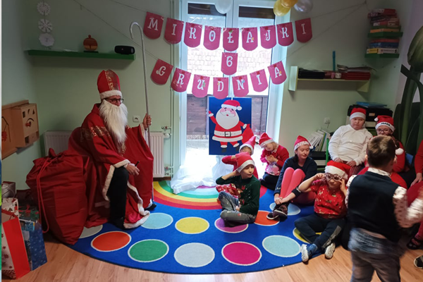 Dzieci obchodziły Mikołajki w pełnej radości i świątecznej atmosferze. Spotkanie z Mikołajem wywołało u wszystkich wiele uśmiechu i entuzjazmu. Każde dziecko otrzymało prezent, co sprawiło mu ogromną przyjemność i wywołało spontaniczne radosne reakcje. Dzieci wraz z opiekunami przygotowały i zaprezentowały radosny taniec dla Mikołaja, który dostarczył wszystkim wiele zabawy i pozytywnych emocji. Wspólne zdjęcia z Mikołajem stały się piękną pamiątką tego wyjątkowego dnia. Spotkanie sprzyjało integracji grupy, rozwijało umiejętności społeczne oraz wprowadziło dzieci w świąteczny, pełen ciepła nastrój, który długo pozostanie w pamięci wszystkich uczestników.