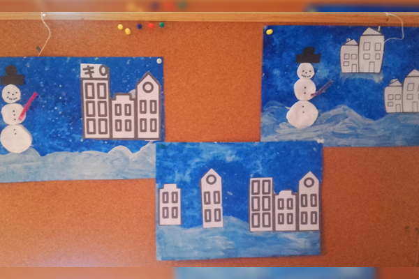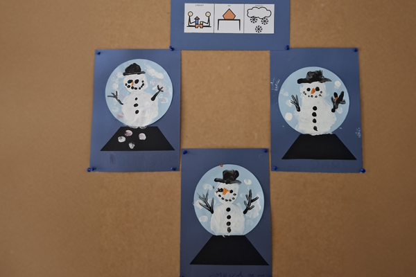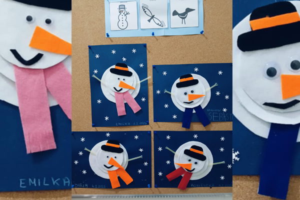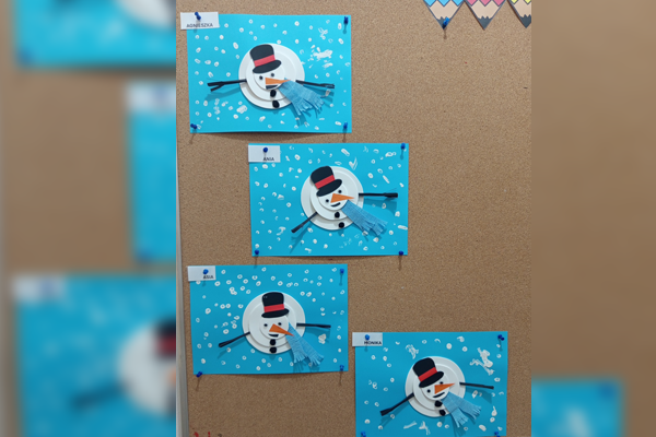 Podczas zajęć uczniowie rozwijali swoje zdolności manualne oraz percepcję wzrokową, wykonując zimowe prace plastyczne. Tworzyli bałwany z kół o różnej wielkości, wyciętych z białej pianki, ucząc się przy tym rozróżniania rozmiarów oraz utrwalając pojęcia związane z wielkością. Następnie, pracując na niebieskim tle, ozdabiali swoje prace płatkami śniegu, które powstawały przy użyciu patyczków kosmetycznych zanurzonych w farbie. Zajęcia sprzyjały rozwijaniu kreatywności, koordynacji wzrokowo-ruchowej oraz koncentracji uwagi, a także były okazją do utrwalania nazw kolorów i doskonalenia sprawności manualnej w przyjaznej, twórczej atmosferze.